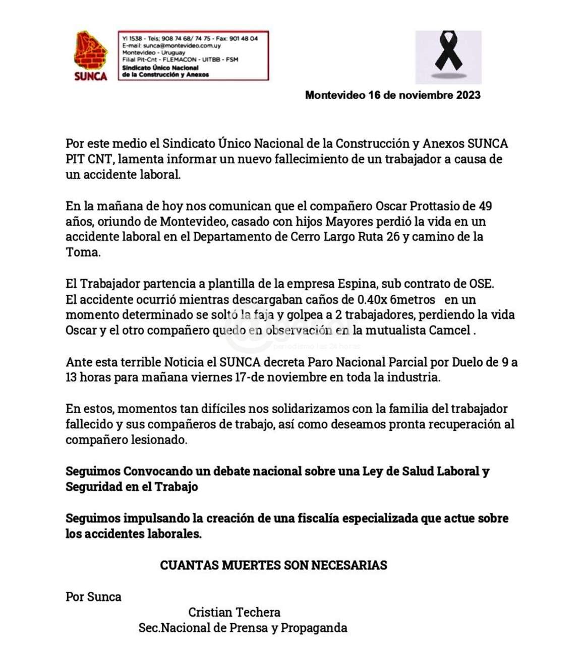 En estos momentos tan difíciles el SUNCA se solidariza con la familia del compañero fallecido, sus compañeros de trabajo y deseamos pronta recuperación al compañero lesionado".