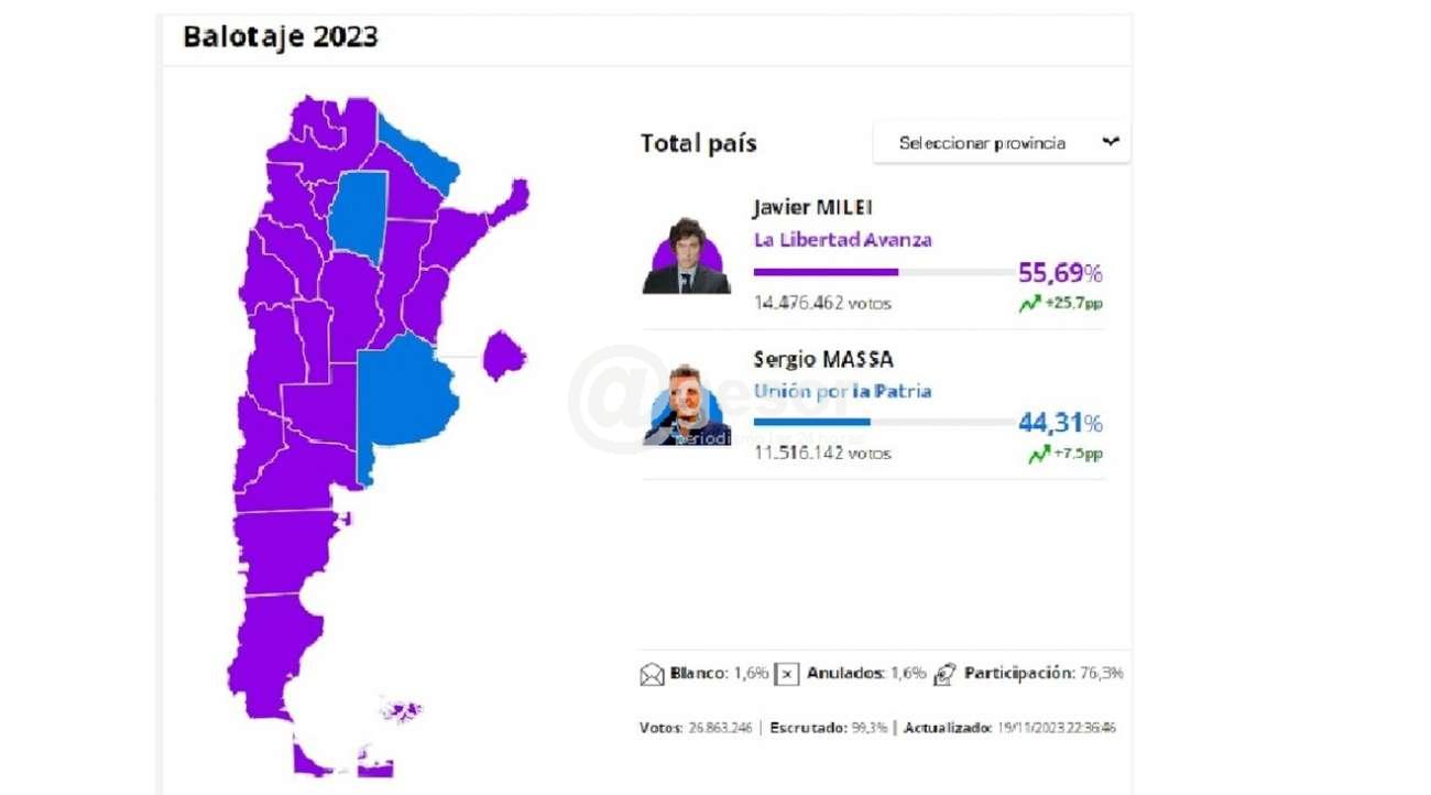 Fue tan aplastante la victoria de Milei que ganó en 21 de las 24 provincias y, en algunas como Córdoba, replicó la paliza a nivel nacional: 74,23%, contra 25,76%. Algo semejante a lo ocurrido en Mendoza: 71,41% contra 28,58%. Pero la peor derrota de Massa ocurrió en Buenos Aires, a pesar de su triunfo, reducto kirchnerista. La victoria del derrotado ministro de Economía dependía en gran parte de que obtuviese aquí una diferencia de 14 puntos, pero su pírrico triunfo por apenas un punto: 50,83% contra 49,16%, ilustra el absoluto descontento del votante argentino ante la desastrosa realidad económica y de corrupción que vive el país.