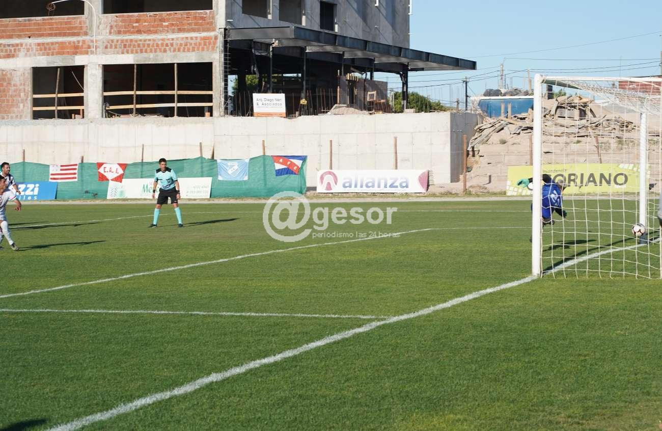 Sin embargo la primer llegada con riesgo es por izquierda, un remate que es trabado, y cae a espaldas de los zagueros, se cruza de derecha a izquierda Walter Domínguez y llega ante que el meta Bacciarini que lo barre y el árbitro pita penal que el mismo Dóminguez trnasforma en gol con remate bajo a la derecha del arquero que va hacia allí pero no llega.