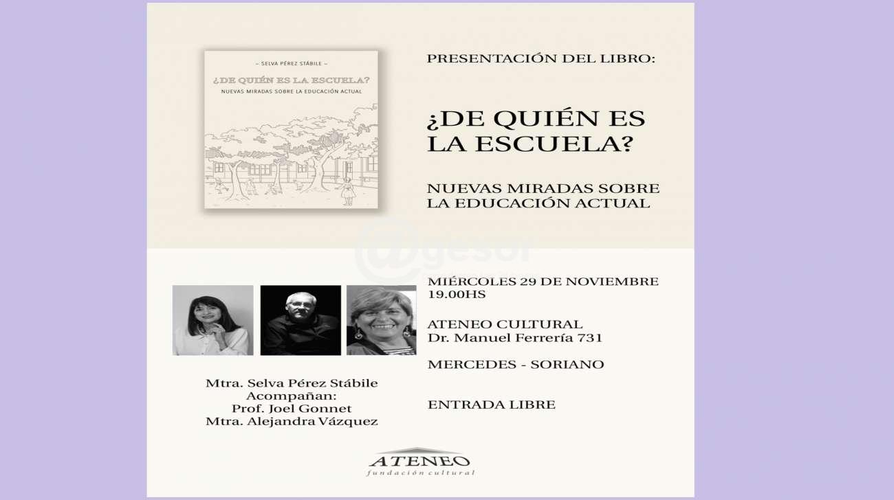 La Comisión de Cultura del Frente Amplio organiza la presentación del libro “ ¿De quién es la Escuela? Nuevas miradas sobre la educación actual?” de Selva Pérez Stábile. La actividad se desarrollará en Ateneo Mercedes (Ferrería 731), este miércoles 29 de noviembre, partir de las 19 horas. Acompañarán a la autora el prof. Joel Gonnet, y la maestra Alejandra Vázquez.
