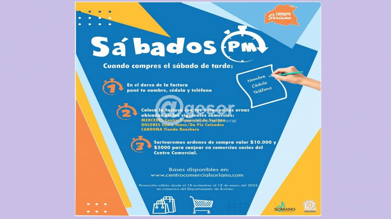 El Centro Comercial e Industrial de Soriano con el apoyo de la Intendencia de Soriano están llevando adelante nuevamente la Promoción Sábados PM. Comprando en comercios de Soriano los sábados de tarde se puede participar de sorteos de órdenes de compra valor $10.000 y $5.000.