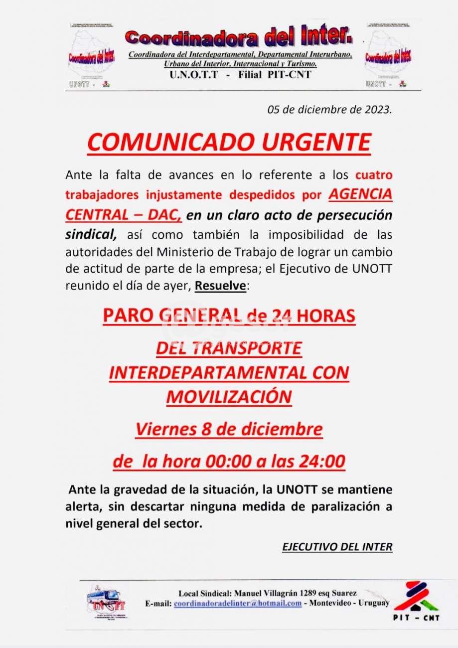 La Coordinadora del Interdepartamental, Departamental Interurbano, Urbano del interior, Internacional y Turismo emitió comunicado urgente en el que expresa "ante la falta de avances en lo referente a los cuatro trabajadores injustamente despedidos por Agencia Central - DAC, en un claro acto de persecución sindical, así como también la imposibilidad de las autoridades del Ministerio de Trabajo de lograr un cambio de actitud de parte de la empresa; el Ejecutivo de UNOTT reunido el día de ayer, resuelve: