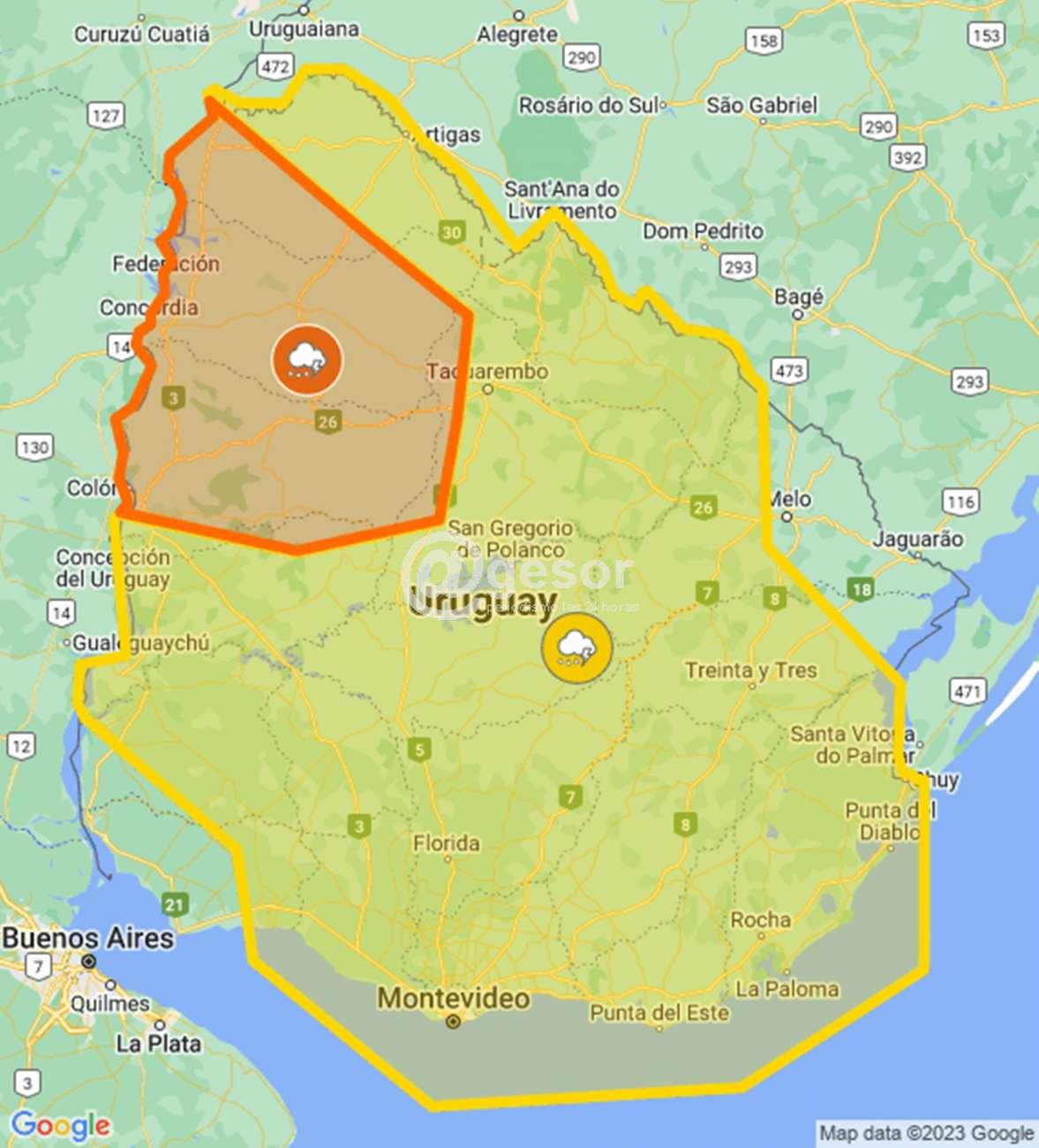 Una doble alerta, emitiò Inumet por tormentas y lluvia. Naranja para los departamentos de Salto y Paysandú, y amarilla para el resto del país, cubriendo casi todo el territorio nacional.