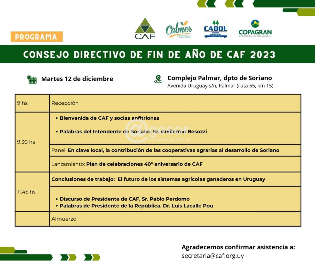 En la oportunidad, se lanzará el plan de celebraciones del 40° aniversario de CAF y se pondrá en valor el aporte de las cooperativas agrarias al desarrollo de Soriano