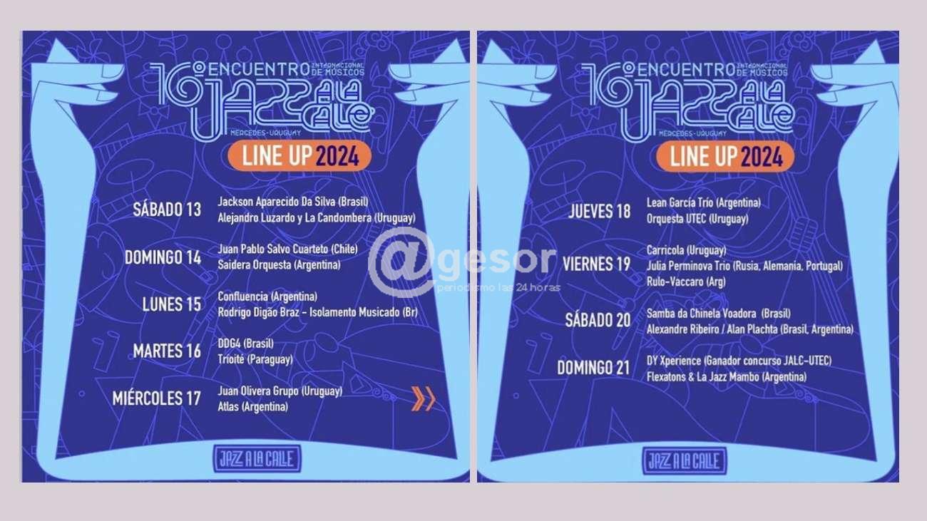 Músicos de Brasil, Argentina, Chile, Praguay, Rusia, Alemania, Portugal y Uruguay actuarán en el escenario mayo el 16° Jazz la Calle. En 2024 el festival que congrega a músicos y público de la región se desarrollará del 13 al 21 de enero. Como es tradicional los espectáculos se realizarán en Manzana 20 y previamente en el barrio del Puerto se realizarán los toques callejeros.
