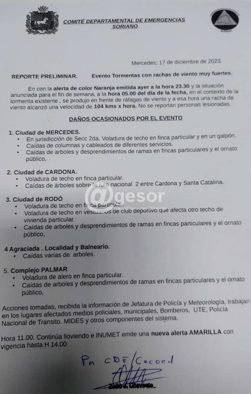 El CECOED emitió un informe preliminar de la situación registrada por la tormenta y el viento fuerte que afecto al departamento. Se produjo una fuete ráfaga de viento, y a las 5 de la mañana de este domingo "una ráfaga de viento que alcanzó una velocidad de 104 kms x hora". Apuntando "no se reportaron personas lesionadas".