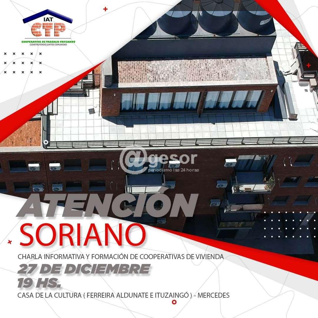 Este miércoles 27 de diciembre a las 19.00 horas en Casa de la Cultura, Ferreira Aldunate e Ituzaingó en Mercedes el Instituto de Asistencia Técnica (IAT) Cooperativa de Trabajo Paysandú invita a charla a informativa y formación de cooperativas de vivienda en Soriano, bajo el lema "Construyendo juntos comunidad".
