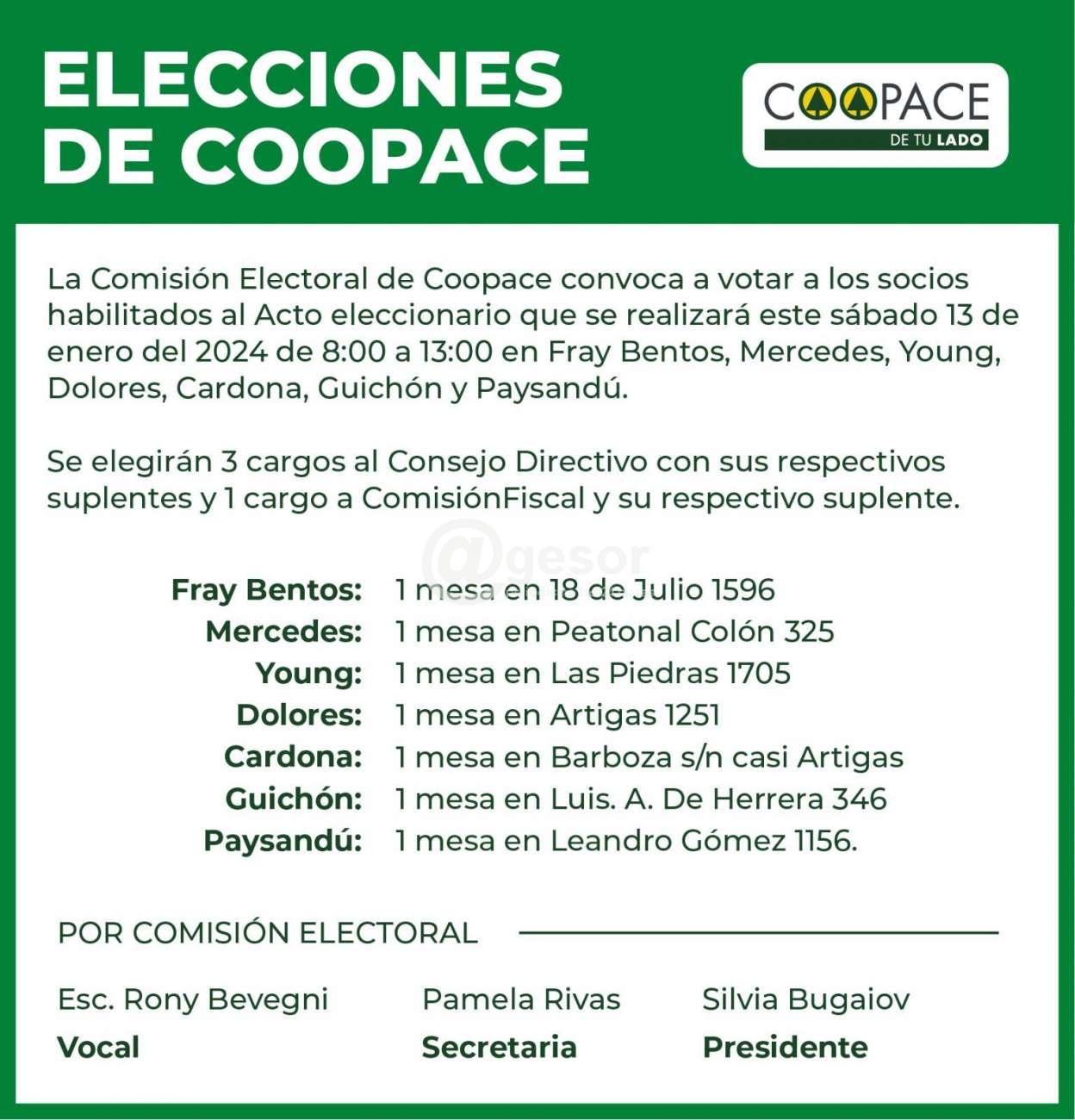 La Comisión Electoral de COOPACE convoca a votar a los socios habilitados al acto elecionario que se realiza este sábado 13 de enero del 2024 de 8.00 a 13.00 en Fray Bentos, Mercedes, Young, Dolores, Cardona, Guichón y Paysandú.
