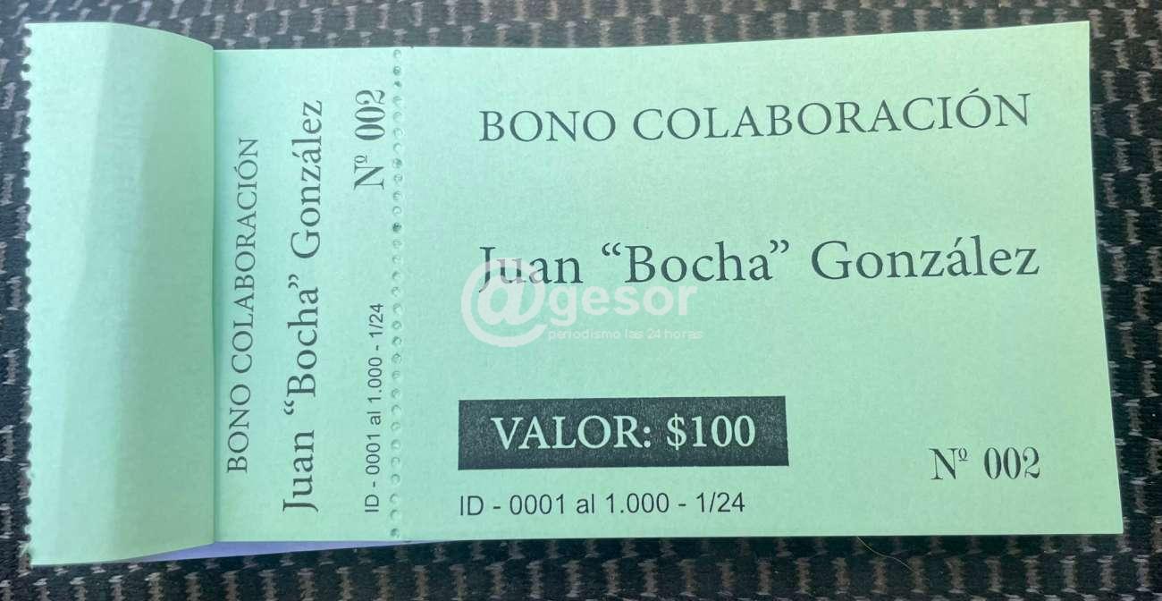 El Edil Luciano Andriolo informó: "Ya tenemos los bonos colaboración valor 100 pesos a beneficio del gran amigo Juan "Bocha" González que fue intervenido quirúrgicamente y precisa una mano de todos nosotros.