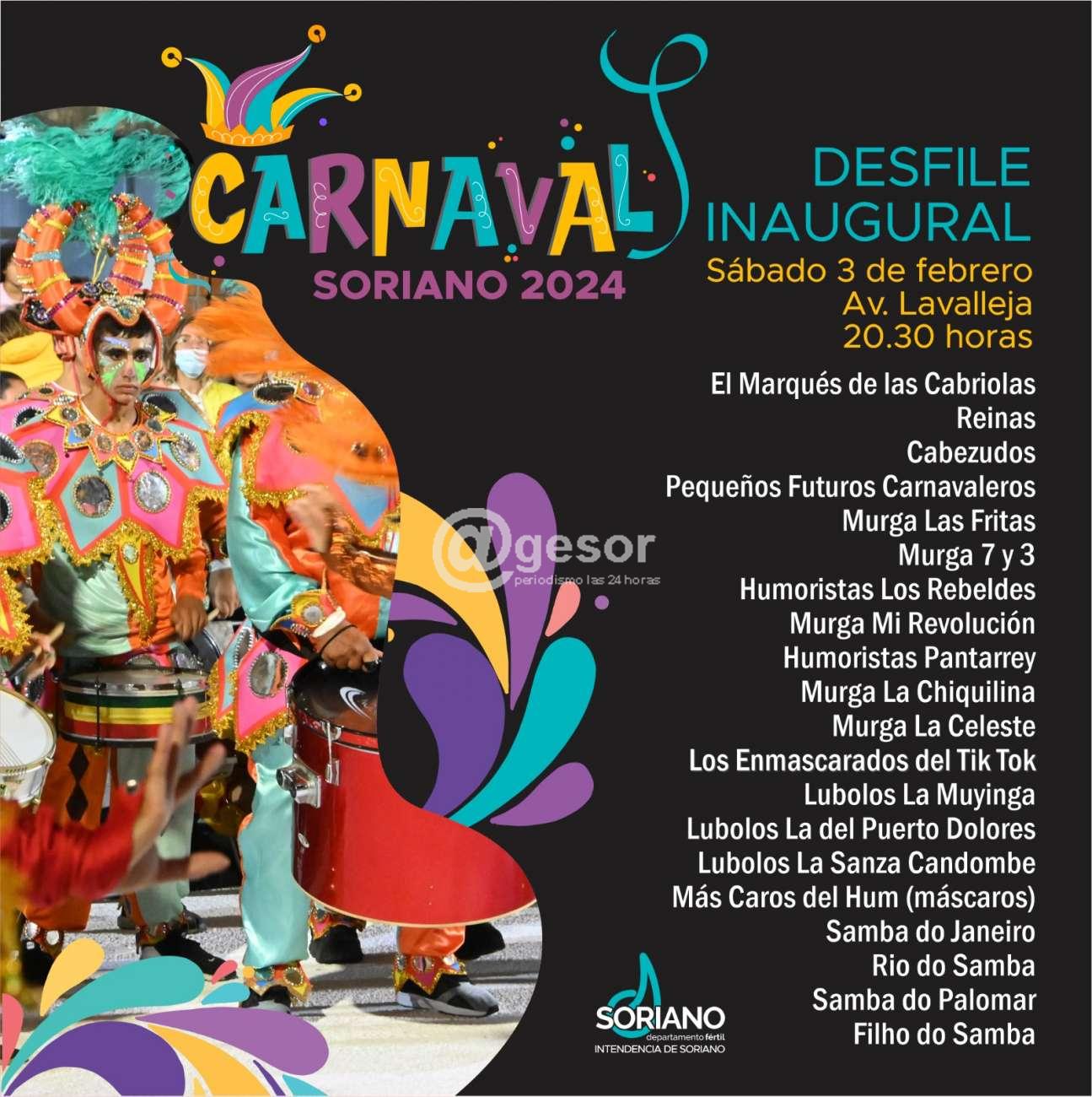 Este sábado 3 de febrero se desarrolla el desfile inaugural del Carnaval de Soriano, por avda. Lavalleja en el trayecto tradicional que va desde Serafín Rivas hasta Luis A. de Herrera, comenzando a las 20.30 horas.