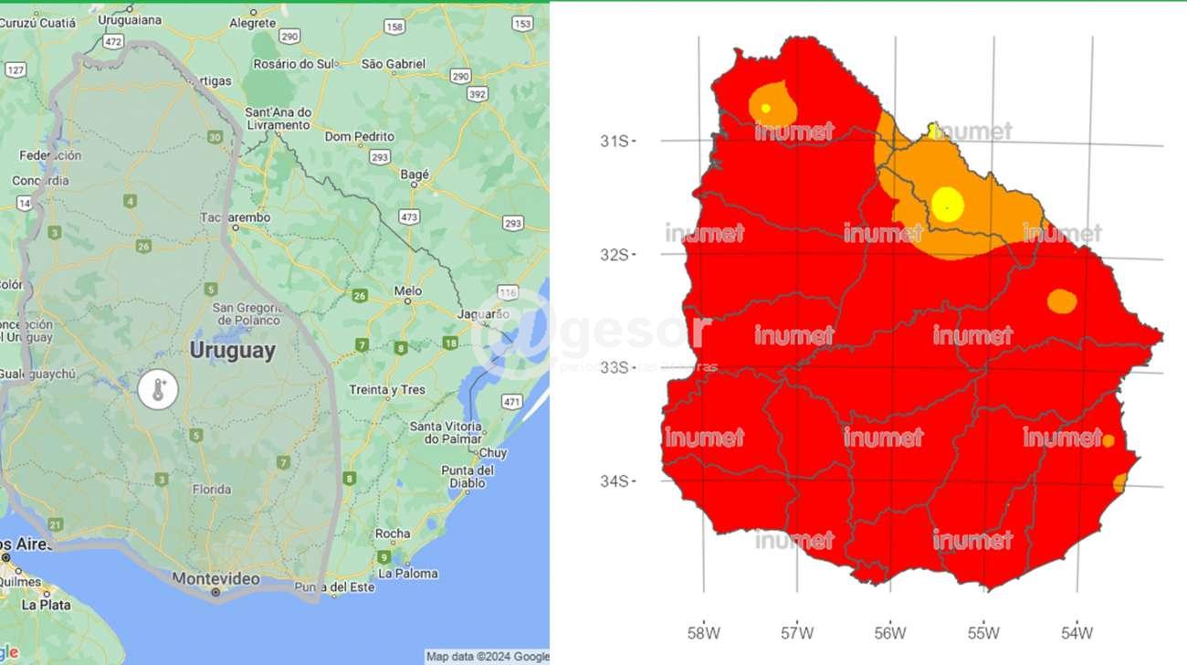 Descripción: Masa de aire muy cálida afecta el país generando altas temperaturas con sensaciones térmicas elevadas. Las temperaturas extremas mínimas serán iguales o superiores a 22/25 ºC y las máximas iguales o superiores a 36/41 ºC, en el centro y litoral oeste del país. En el resto del área del aviso, las temperaturas extremas mínimas serán iguales o superiores a 21/24 ºC y las máximas iguales o superiores a 34/38 ºC. El domingo 4, el pasaje de un frente frío afectará los departamentos costeros del sur y este, provocando un descenso temporario de las temperaturas; incrementando nuevamente a partir del lunes 5. Cabe aclarar que en zonas donde se desarrollen tormentas y lluvias, las temperaturas podrán descender levemente en forma temporaria. Se continuará monitoreando la situación y se informará ante eventuales cambios.