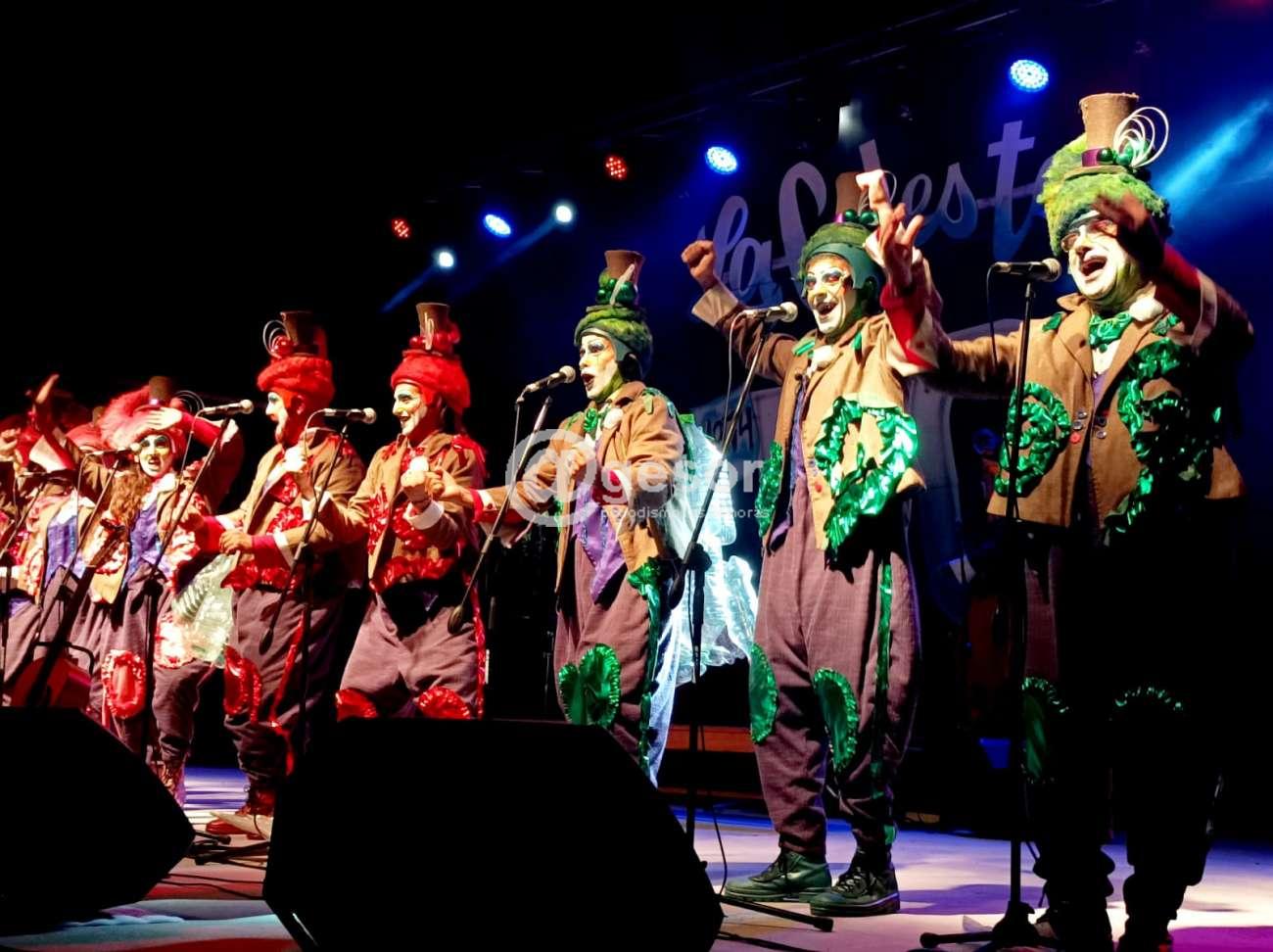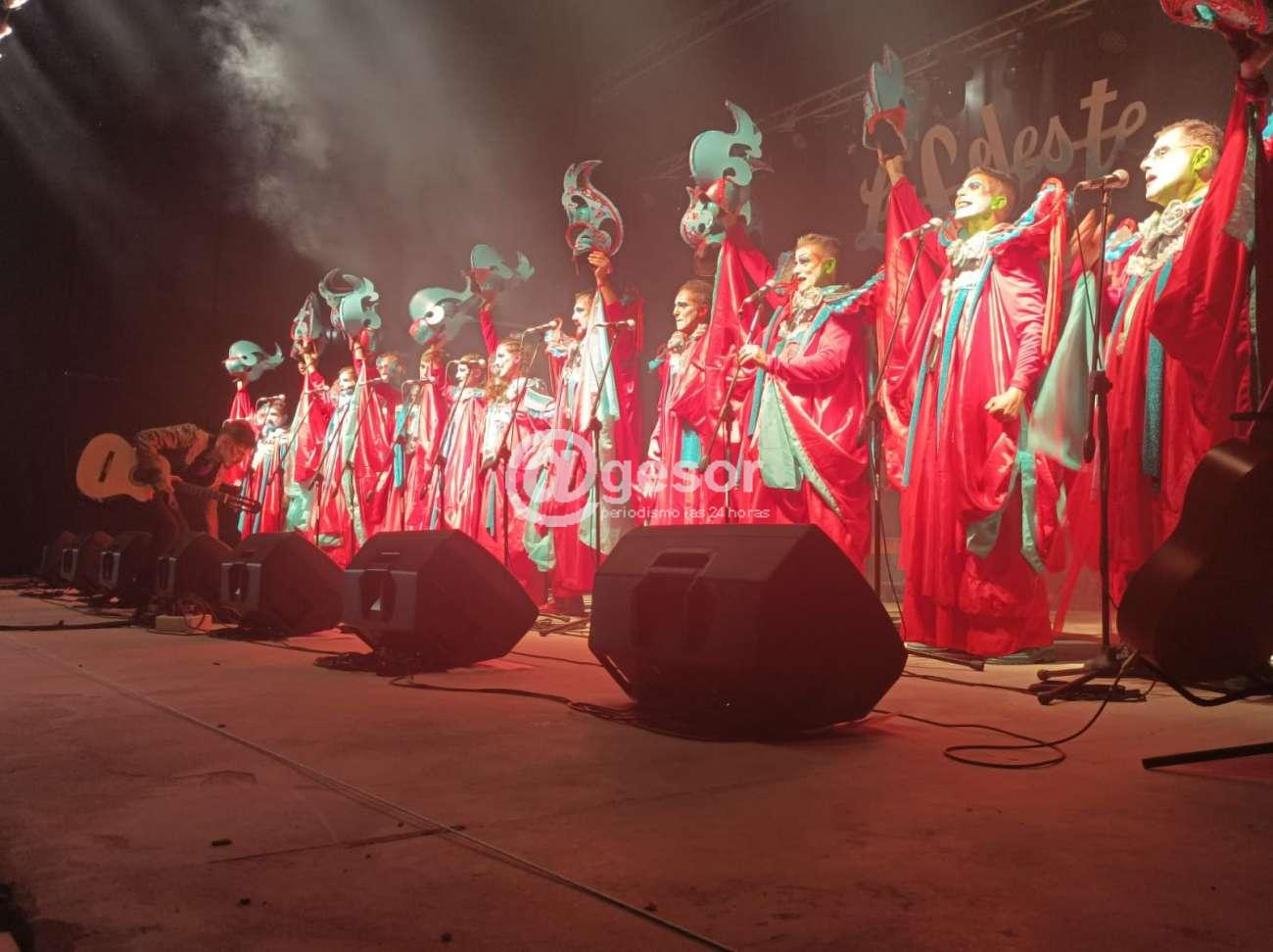 Y por momentos se hizo sentir, pero sabemos que la característica de "La Celeste" y por ende su gente es la de ir con la corazón en la mano a entregar todo, a ponerle todo pero para ello debe tener en consonancia el texto con la interpretación, y allí es donde la propuesta que puede tener momentos interesantes, con una murga que cuando canta se muestra firma, el coro responde bien, hay solistas en muy buen nivel, entendemos que hay algo, que para las características de una murga "guerrera" como la celeste, la propuesta necesitaría un ajuste y tiene que ver con el hilo conductor y no es que quien lo lleva lo haga mal, todo lo contrario consideramos que la interpretación es correcta y tiene buenos momentos, pero son muchas las interrupciones y quizás demasiado largas. Son momentos donde al presentar cada ciclo, el hilo conductor asume el protagonismo y la escena es toda suya, la murga desaparece o está a la sombra, a lo escuro en el escenario, el grupo como tal pierde protagonismo y con ello cae la musicalidad, la continuidad del espectáculo se ve comprometida, pero ello es fácilmente corregible para darle continuidad y que la murga pueda cantar más que es donde más luce y donde históricamente su gente se "prende" y acompaña.