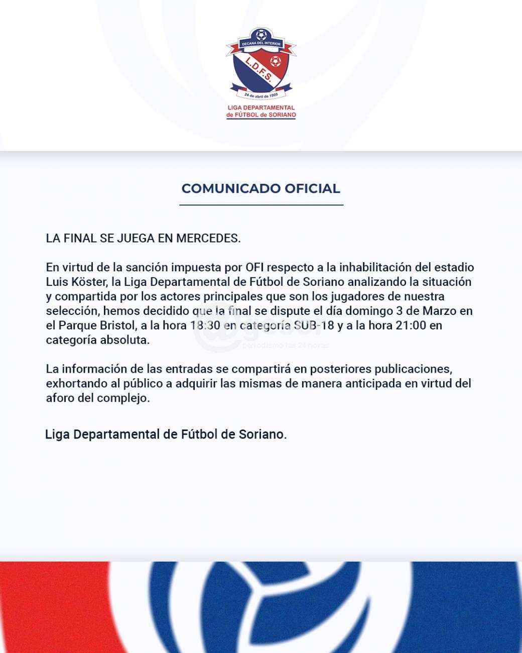 En virtur de la sanción impuesta por OFI respecto a la inhabilitación del estadio Luis Koster, la Liga Departamental de fútbol de Soriano analizando la situaición y compartida por los actores principales que son los jugadores de nuestra selección, hemos decidido que la final se dispute el día domingo 3 de Marzo en el Parquje Bristol, a la hora  18,30 en categoría Sub 18 y a las  21 horas en categoría absoluta.