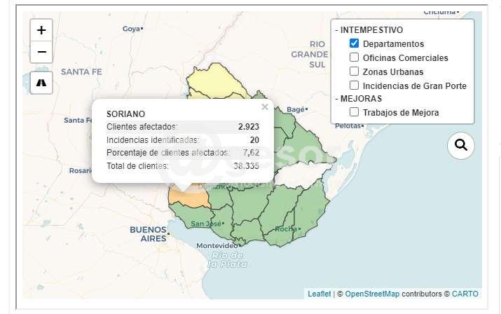 Casi el 8% de los clientes de UTE actualmente están sin servicio de energía eléctrica producto del temporal de agua y viento que se produjo en la noche anterior. A esta hora, en base a datos del propio organismo son 2.923 clientes de UTE que no cuentan con el servicio de energía eléctrica, por 20 cortes detectados
