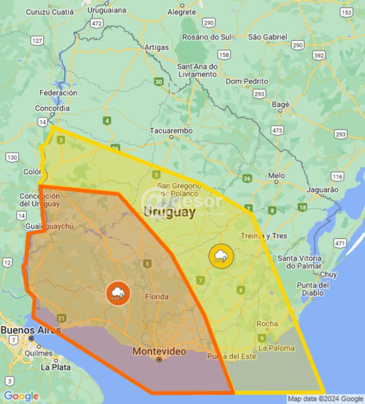 INUMET emitió alerta naranja desde las 14.35 horas y lo actualizó a las 17.00, extendiéndolo hasta las 19.00 horas, incluyendo 75% de probabilidades de ocurrencia de tormentas fuertes y lluvias intensas y abarca todo el departamento de Soriano.