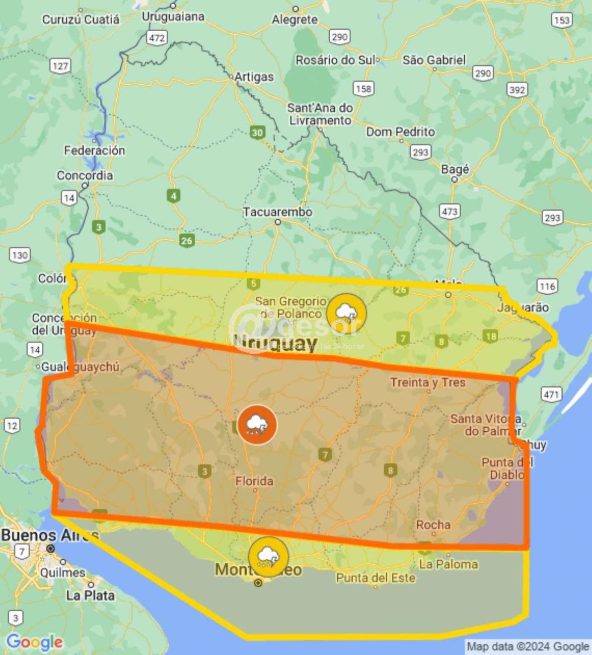 INUMET emitió alerta naranja a las 23.50 horas que se actualizará a las 3.00 de la madrugada en la que se incluye a todo el departamento de Soriano por persistencia de tormentas y lluvias, con probabilidad de ocurrencia de 75%.