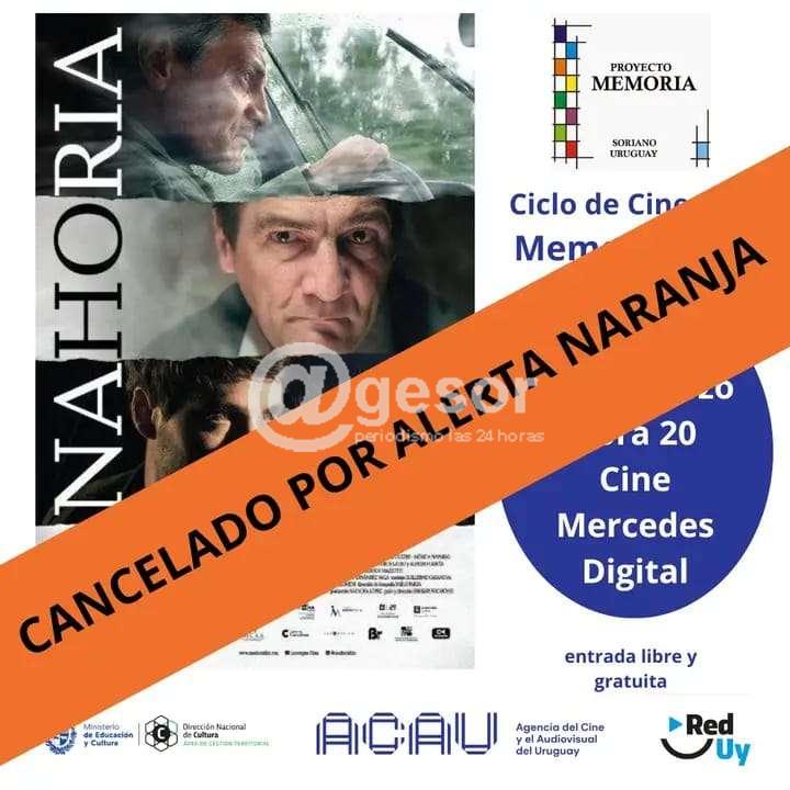 Comisión Memoria, Justicia, y contra la Impunidad de Soriano informó que que el retomo este miércoles de Cine foro debió ser suspendido por alerta naranja emitido por INUMET. Este miércoles 20 de marzo, en Cine Mercedes ditigal se iba a proyectar la película nacional "Zanahoria", inspirada en hechos reales.