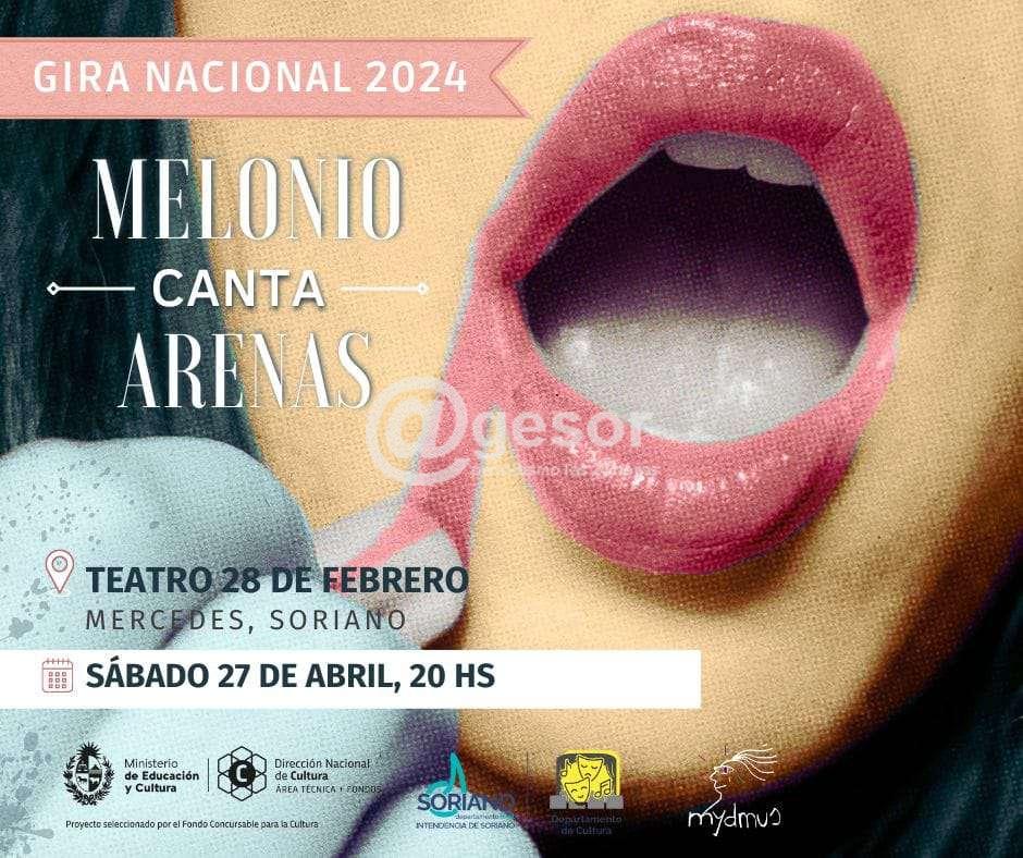 La cantante Estefanía Melonio se presentará el 27 de abril próximo en el Teatro 28 de febrero de Mercedes. Será en el marco de una gira nacional, con su espectáculo Canta Arenas, que fuera seleccionado por los Fondos Concursales para la cultura del Ministerio de Educación y Cultura.
