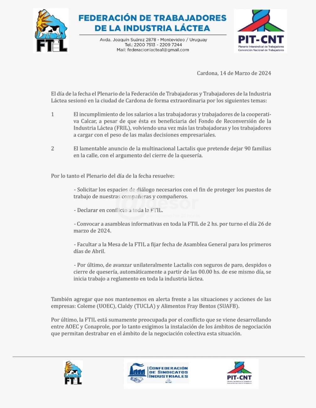 El comunicado de la Federación de Trabajadores de la Industria Láctea expresa: