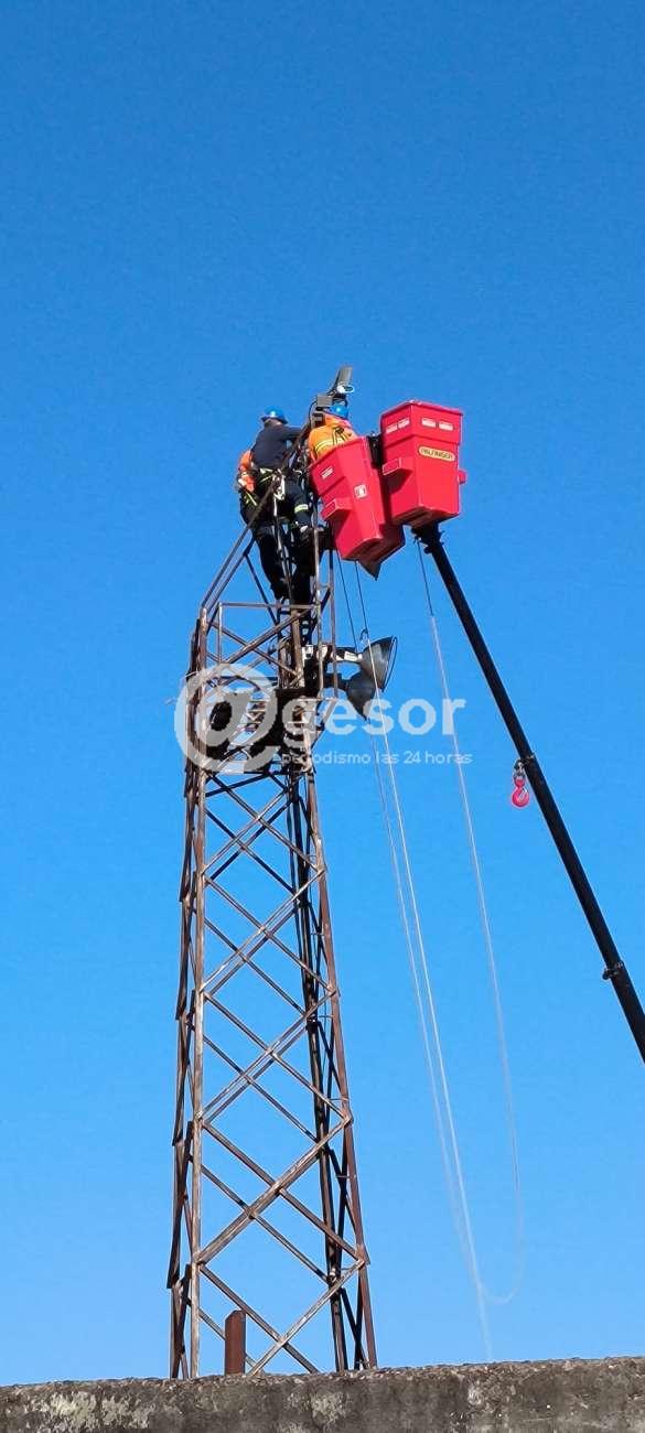 Esta mañana personal de la sección Iluminación realizó recambio de focos en las torres, que fueron dañados por el último temporal.