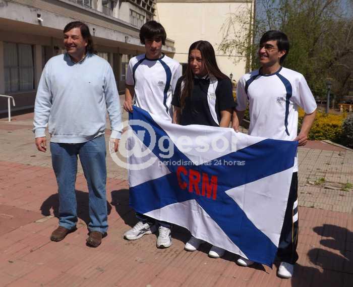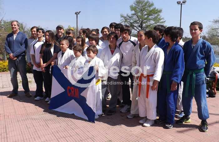 El entrenador de judo del Club de Remeros Mercedes, Profesor Juan Fernández, y dos de sus dirigidos, Julieta González y Manuel Marrero, recibieron este sábado una bandera de la institución costera con motivo del viaje que realizan este fin de semana hacia Perú.