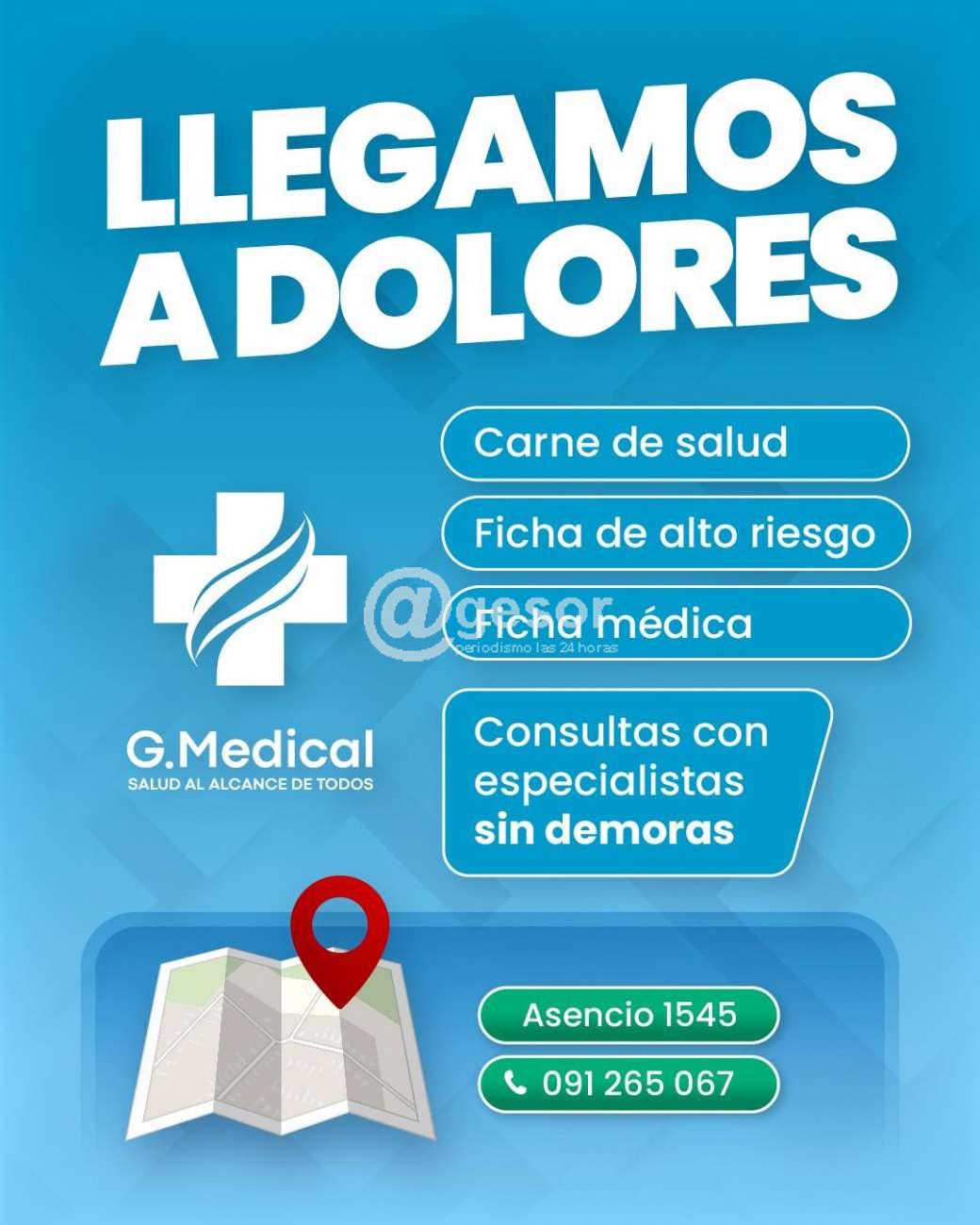 Allí en Dolores podrán encontrar entre otros servicios que ofrece desde este jueves G. Medical, la expedición de carné de salud, ficha médica de alto riesgo, ficha médica, consultas con especialistas sin demoras.