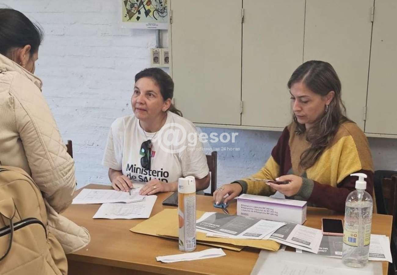 En las fotografías la Dra. María del Luján Graña (der) y la Lic. Mariela Guerein referente de Epidemiología, entregando antibióticos a padres de alumnos de la Escuela 7 que tuvieron contacto con el niño al menos 4 horas diarias en los últimos 7 días