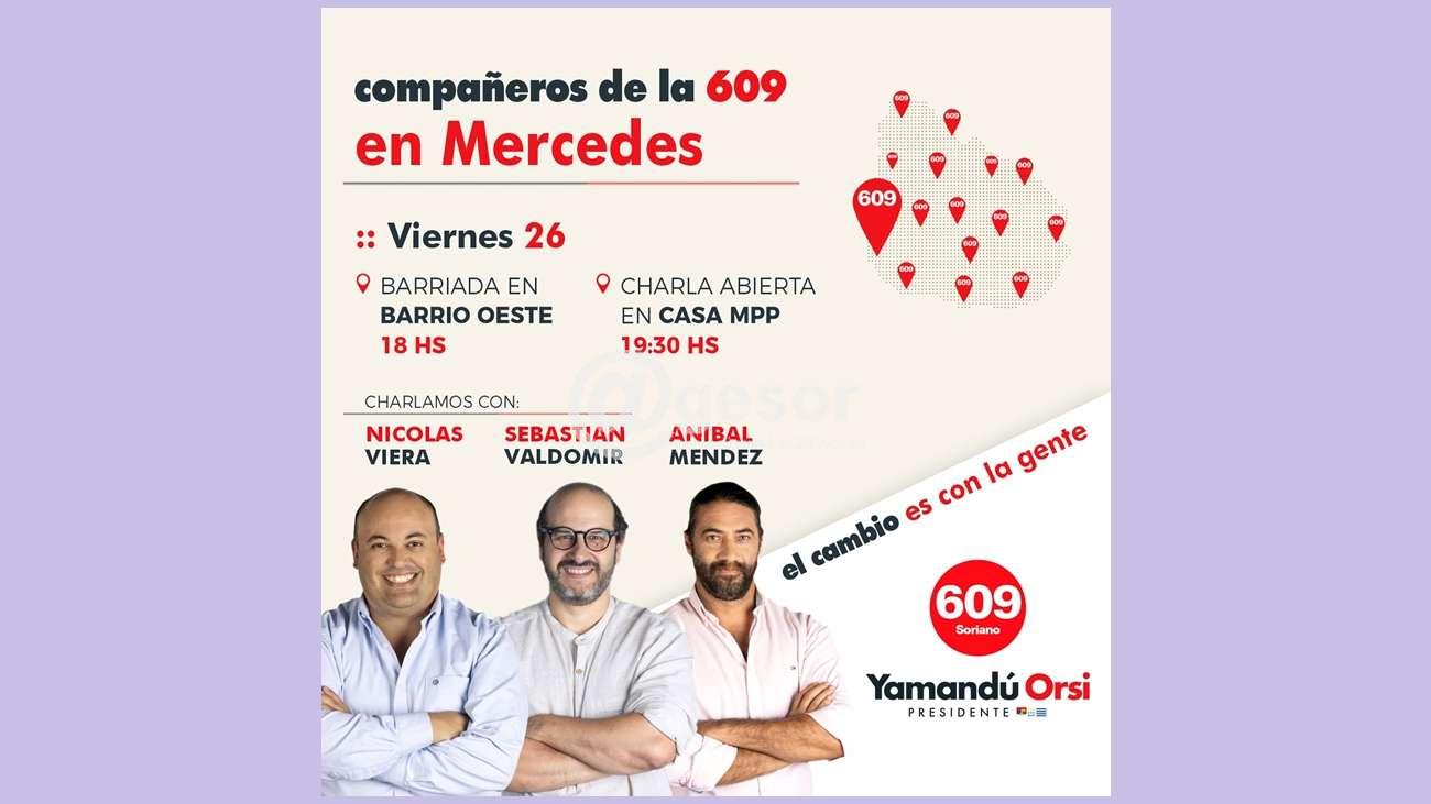 En la  gira nacional que está haciendo la   Lista 609 en el marco de las elecciones internas,   los diputador  Nicolás Viera  y  Sebastián  Valdomir  recorrerán  Dolores y Mercedes.  Lo  harán acompañados de   Aníbal Méndez  y otros dirigentes locales en apoyo a la candidatura de  Yamandú Orsi