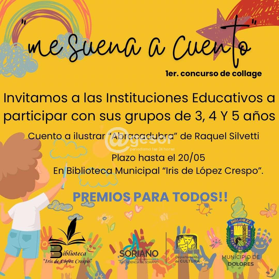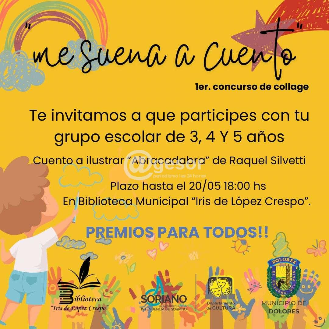 “Me suena a cuento”: Desde el Municipio de Dolores invitan a todas las instituciones educativas a participar del primer concurso de collage con sus grupos de 3, 4, 5 años (un dibujo por grupo escolar), el cuento a ilustrar: “Abracadabra” de Raquel Silvetti, el plazo hasta el 20/5 en Biblioteca Municipal “Iris de López Crespo” (horario de atención de 8.00 a 18.00).