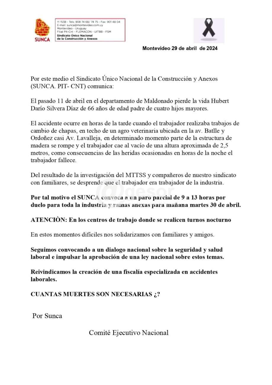 El SUNCA convoca a un paro parcial por duelo de 9 a 13 horas para mañana martes 30 de abril. Al tiempo que reiteran la necesidad de la creación de una Fiscalía especializada en accidentes laborales.