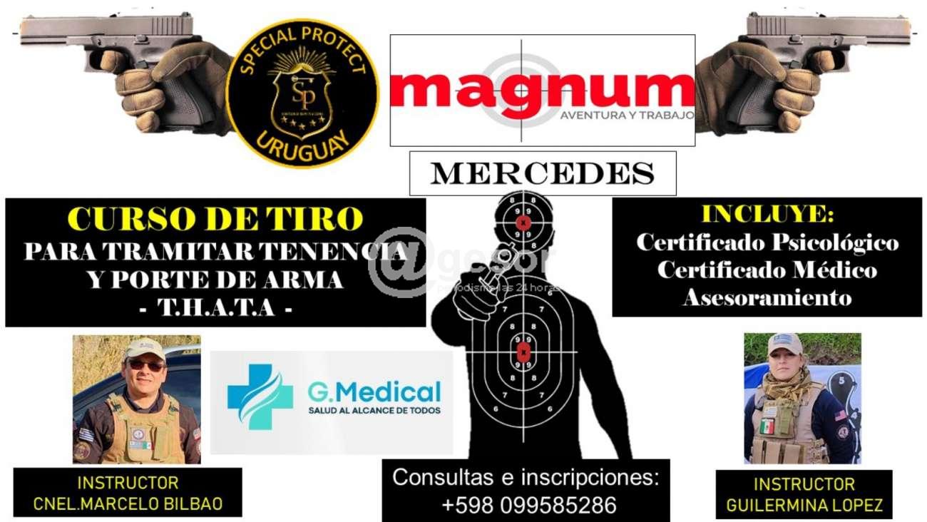 Magnum Mercedes y G.Medical están organizando jornada en Mercedes, en la que ofrecen curso de tiro para tramitar tenencia y porte de arma THATA incluyendo certificado psicológico, certificado médico y asesoramiento.