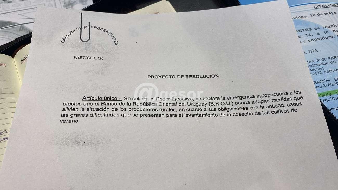 La Diputada María Fajardo, que apoyó el Proyecto con su voto, siguió de cerca la iniciativa que luego de haber sido tratada por la Comisión de Ganadería, Agricultura y Pesca, fue aprobada con el siguiente texto: “Se solicita al Poder Ejecutivo, se declare la emergencia agropecuaria a los efectos de que el Banco de la República Oriental del Uruguay pueda adoptar medidas que alivien la situación de los productores rurales, en cuanto a sus obligaciones con la entidad, dadas las graves dificultades que se presentan para el levantamiento de la cosecha de los cultivos de verano”.