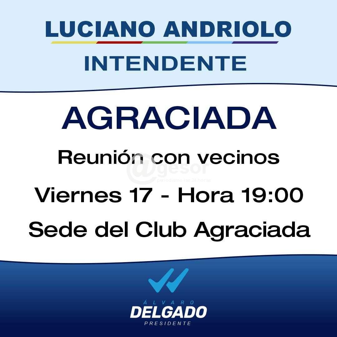 Este viernes 17 de mayo, a las 19 horas, Luciano Andriolo, candidato a Intendente, se reunirá con vecinos de Agraciada. Será en la sede del Club Agraciada.