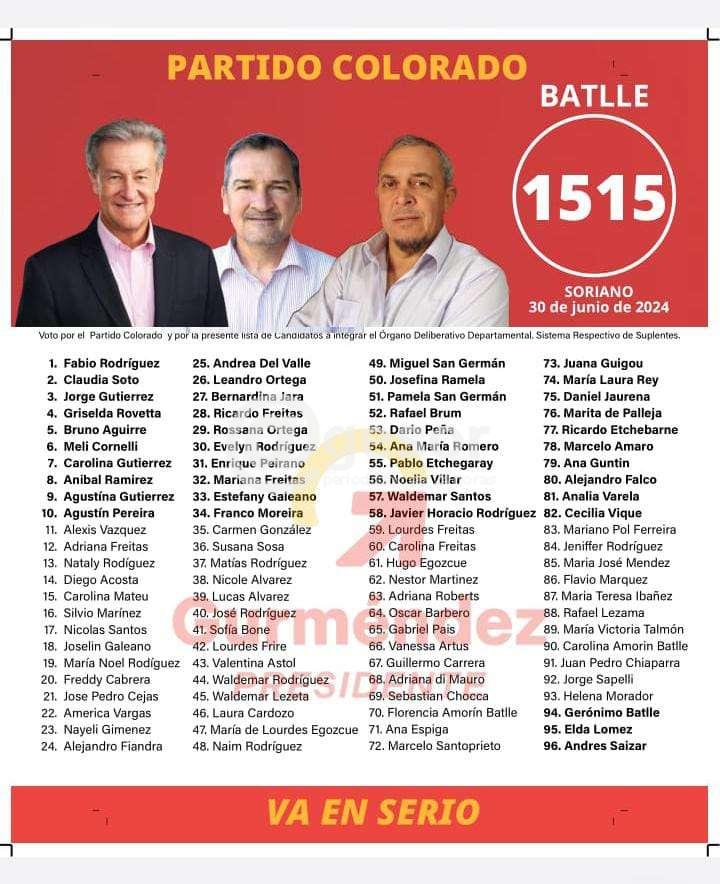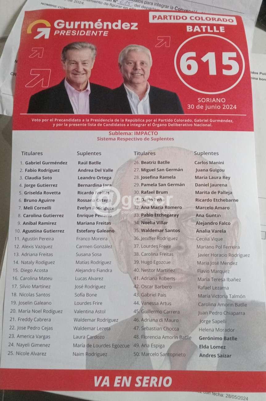 Este miércoles quedaron presentadas ante la Junta Electoral de Soriano, las hojas de votación 615 y 1515 del Partido Colorado, que en lo nacional impulsan la precandidatura a la presidencia de la República de Gabriel Gurméndez con la 615, mientras que a su vez se incluyen los candidatos a la Convención Nacional, sublema Impacto, cuyos primeros 10 lugares ocupan: