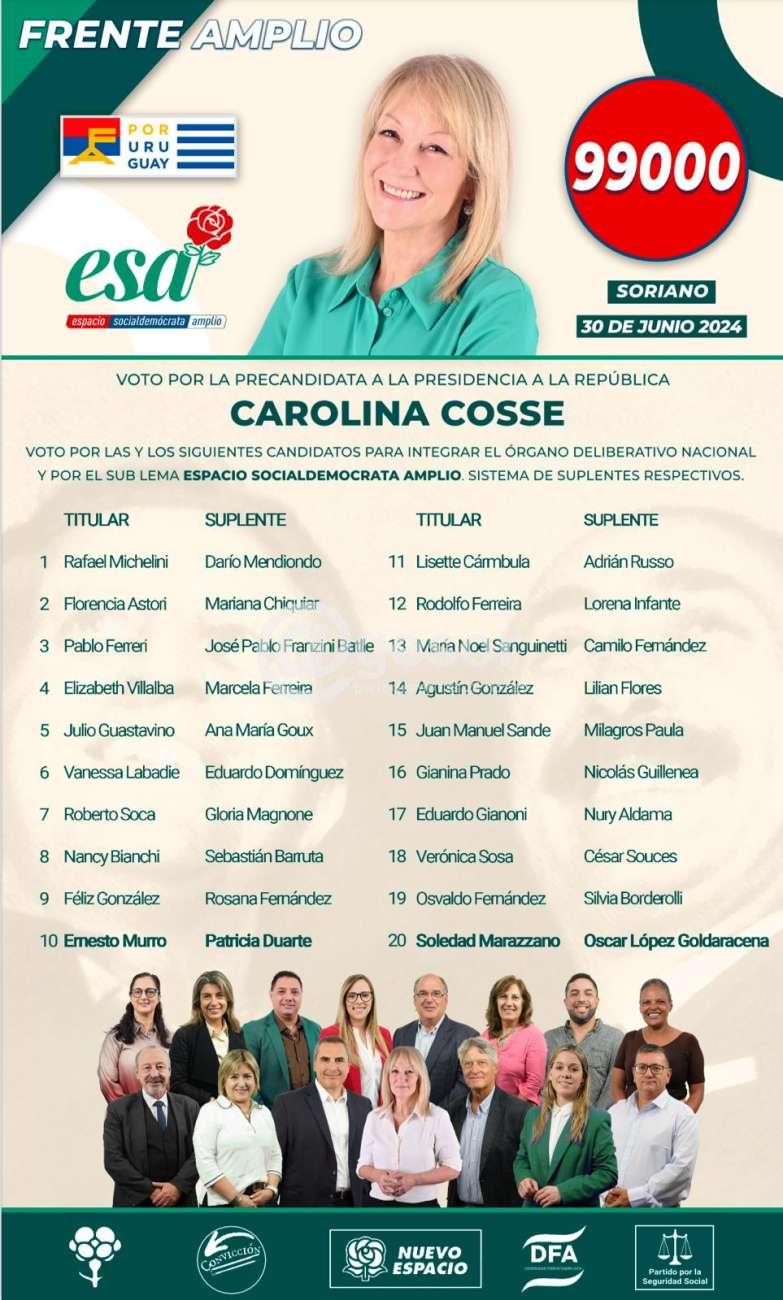 La hoja 99000 del ESA que impulsa a Carolina Cosse, a nivel nacional, tiene como principales candidatos en los primeros 10 lugares a la Convención Nacional a: Rafael Michelini, Florencia Astori, Pablo Ferreri, Elizabeth Villalba, Julio Guastavino, Vanessa Labadie, Roberto Soca, Nancy Bianchi, Féliz González, Ernesto Murro.