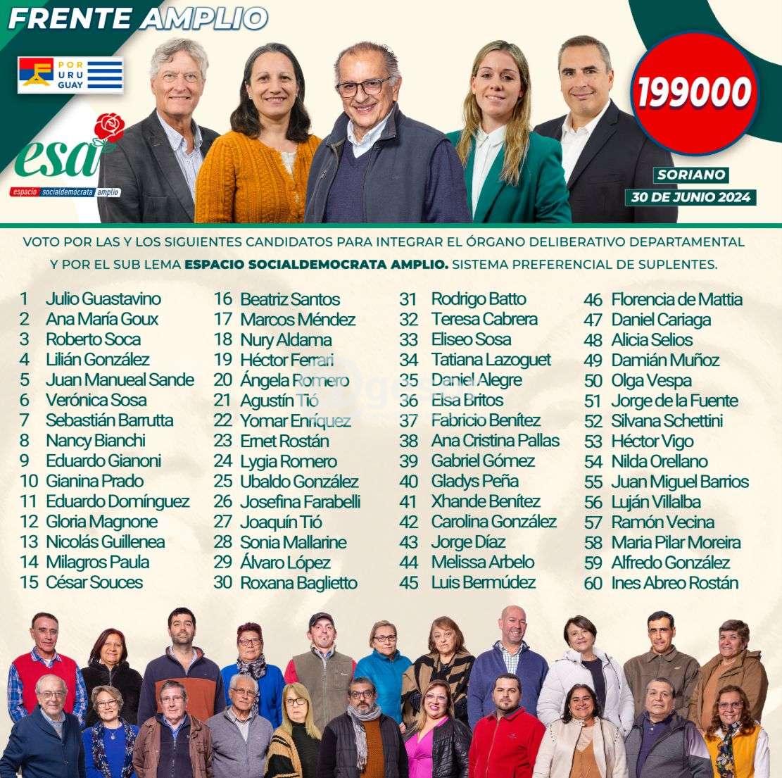 En la sala de sesiones de la Junta Electoral de Soriano quedaron presentadas las hojas de votación 99000 y 199000 correspondientes al Espacio Socialdemócrata Amplio (ESA) que apoya la precandidatura a la presidencia de la República de Carolina Cosse y que a nivel de Soriano tiene como principal referente a Julio Guastavino.