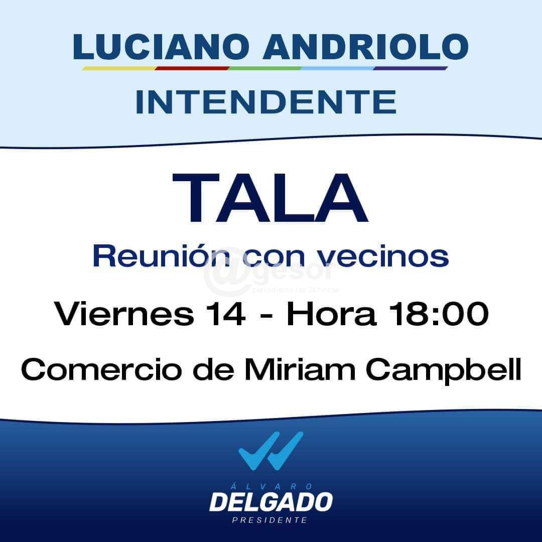 Este viernes, Luciano Andriolo, candidato a Intendente por el Partido Nacional, dialoga con vecino de Tala. Será una reunión que se realizará en el Comercio de Miriam Campnbell, comenzando a las 18 horas.
