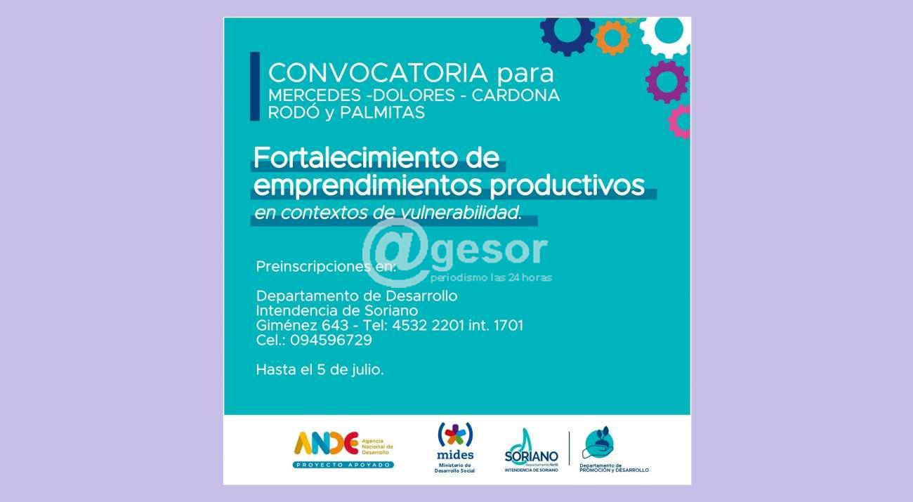 El otro llamado vigente para apoyar emprendedores, surge del convenio en conjunto con la Intendencia de Soriano y Ande, En el marco del Proyecto Fortalecimiento de emprendimientos productivos llevado adelante se llama a interesados en acceder a una intervención integral en emprendimientos dirigidos por personas en situación de vulnerabilidad en las localidades de Mercedes, Dolores, Palmitas, Cardona y José E. Rodó. La misma prevé tanto apoyo desde lo técnico como en la metodología de trabajo; mediante la conformación de un equipo técnico multidisciplinario que abordará los aspectos económicos y sociales los emprendedores seleccionados, quienes comenzarán un proceso de capacitación y asistencia técnica.