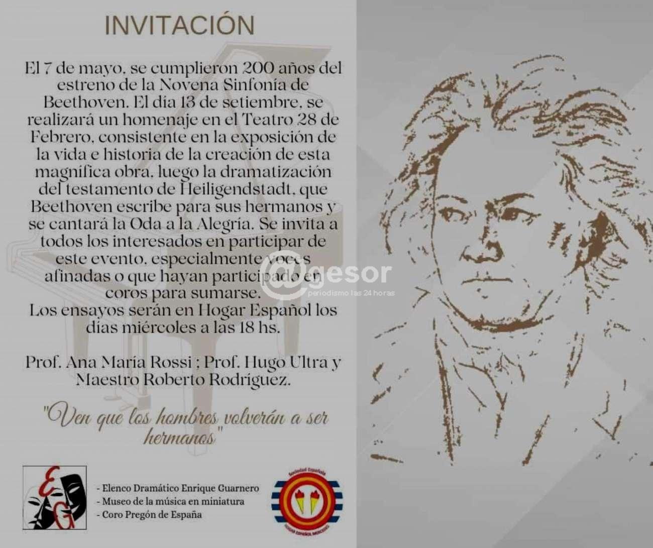 El 13 de setiembre, se realizará un homenaje en el teatro "28 de Febrero", consistente en la exposición de la vida e historia de la creación de esta magnífica obra, luego la dramatización del testamento de Heiligendstadt, que Beethoven escribe para sus hermanos y se cantará la Oda a la Alegría.