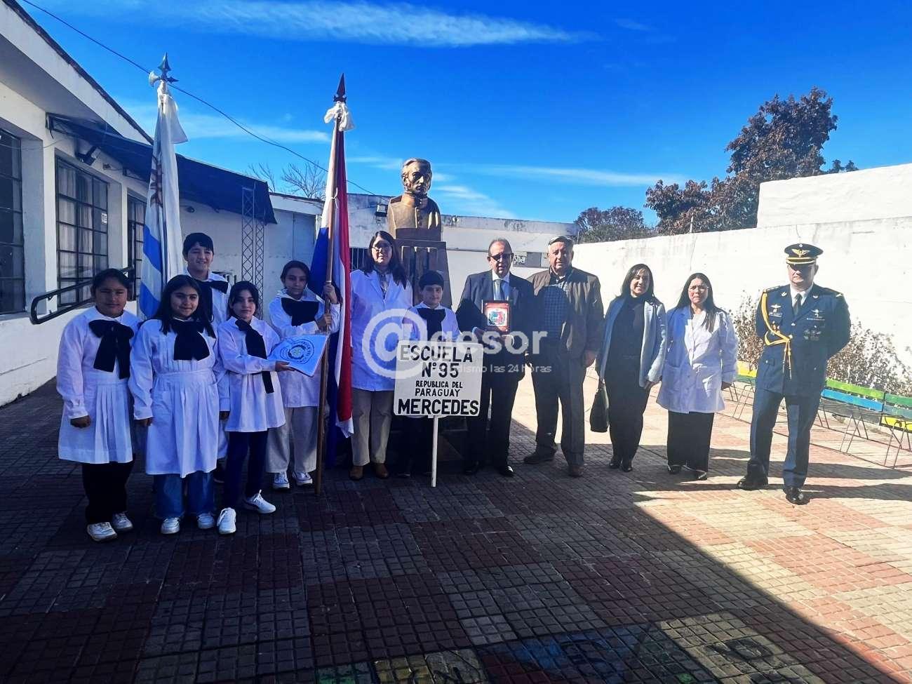 El Embajador de Paraguay en Uruguay, Didier César Olmedo Adorno, acompañado de la Ministra María Guadalupe Irala de Hernández, visitó Mercedes cumpliendo diferentes actividades, entre ellas reuniéndose con el Intendente de Soriano Guillermo Besozzi, concurriendo a los homenajes al aviador sorianense Luis Tuya y visitando la Escuela Nº 95 República del Paraguay en el barrio Oeste de Mercedes donde fue recibido por la Directora del centro de enseñanza Carla Varela, estando presentes, entre otros también en esta ocasión en dicha escuela integrantes de Comisión de Hogar Español, encabezados por su Presidente Ulises García, Esc. Sandra Rüsch, asimismo Martha Giménez exdirectora de la escuela, integrantes de Comisión de Fomento, alumnos, docentes y padres de la escuela.