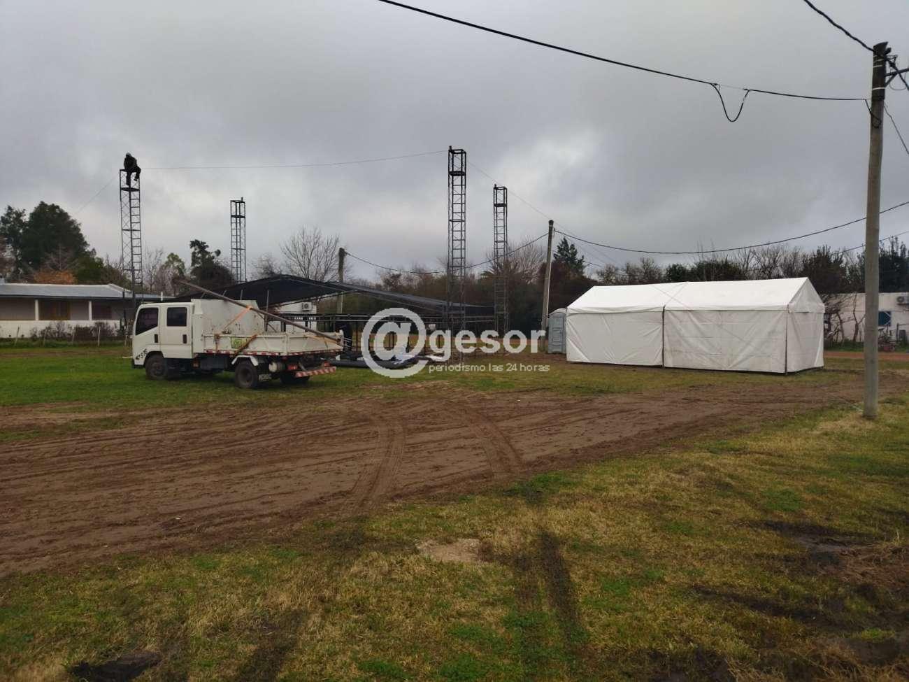 Mientras se hace el montaje del escenario para los espectáculos artísticos en la zona situada frente a la Estación Fluvial, se realiza el armado de la zona de palco y toda la infraestructura necesaria para el desfile.