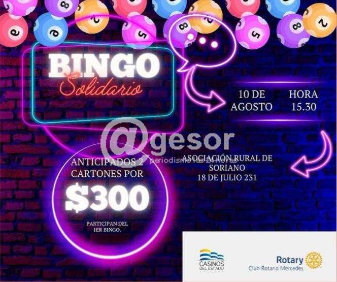 Este sábado se realizará el Bingo Solidario de Rotary. Esta vez se realizará en la Asociación Rural de Soriano (18 de julio 231) para brindar más accesibilidad a la concurrencia. Comenzará a las 15.30hs, contándose con el apoyo de Casinos del Estado.