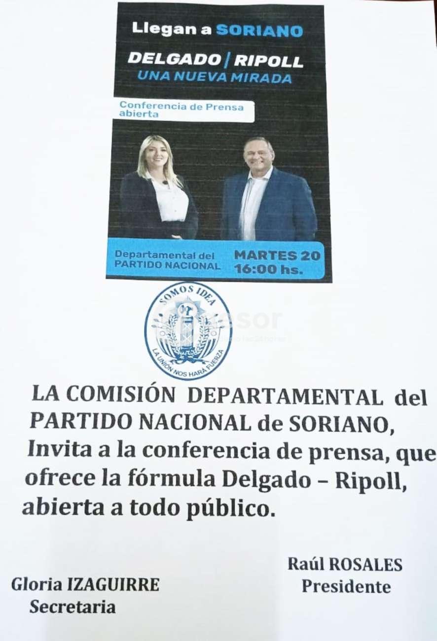 LA COMISIÓN DEPARTAMENTAL del PARTIDO NACIONAL de SORIANO, invita a la conferencia de prensa, que ofrece la fórmula Delgado - Ripoll, abierta a todo público.
