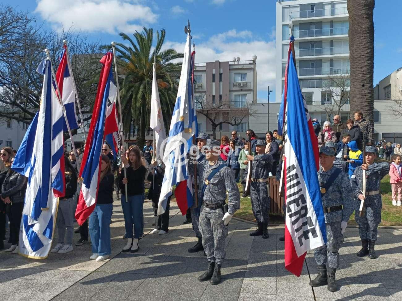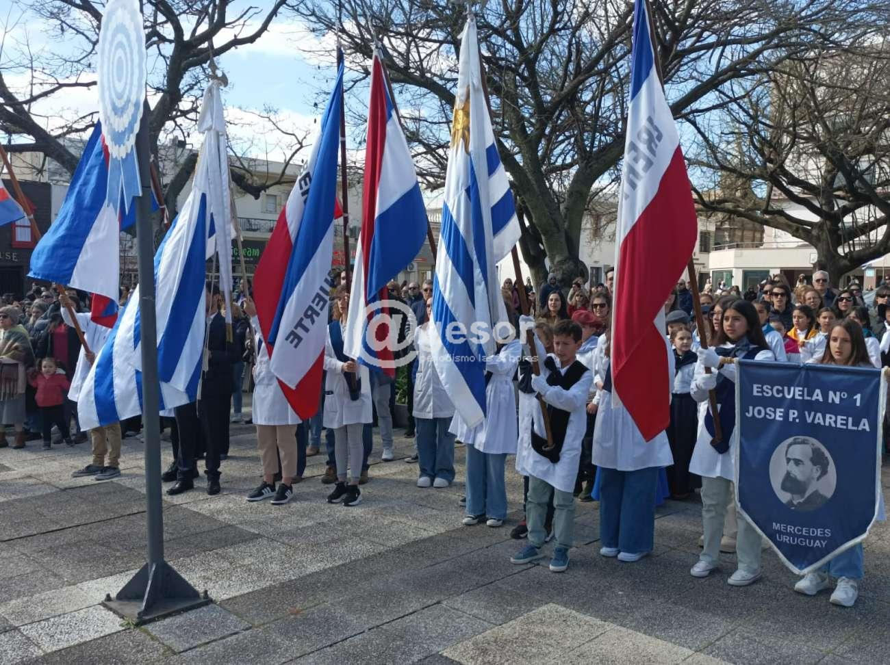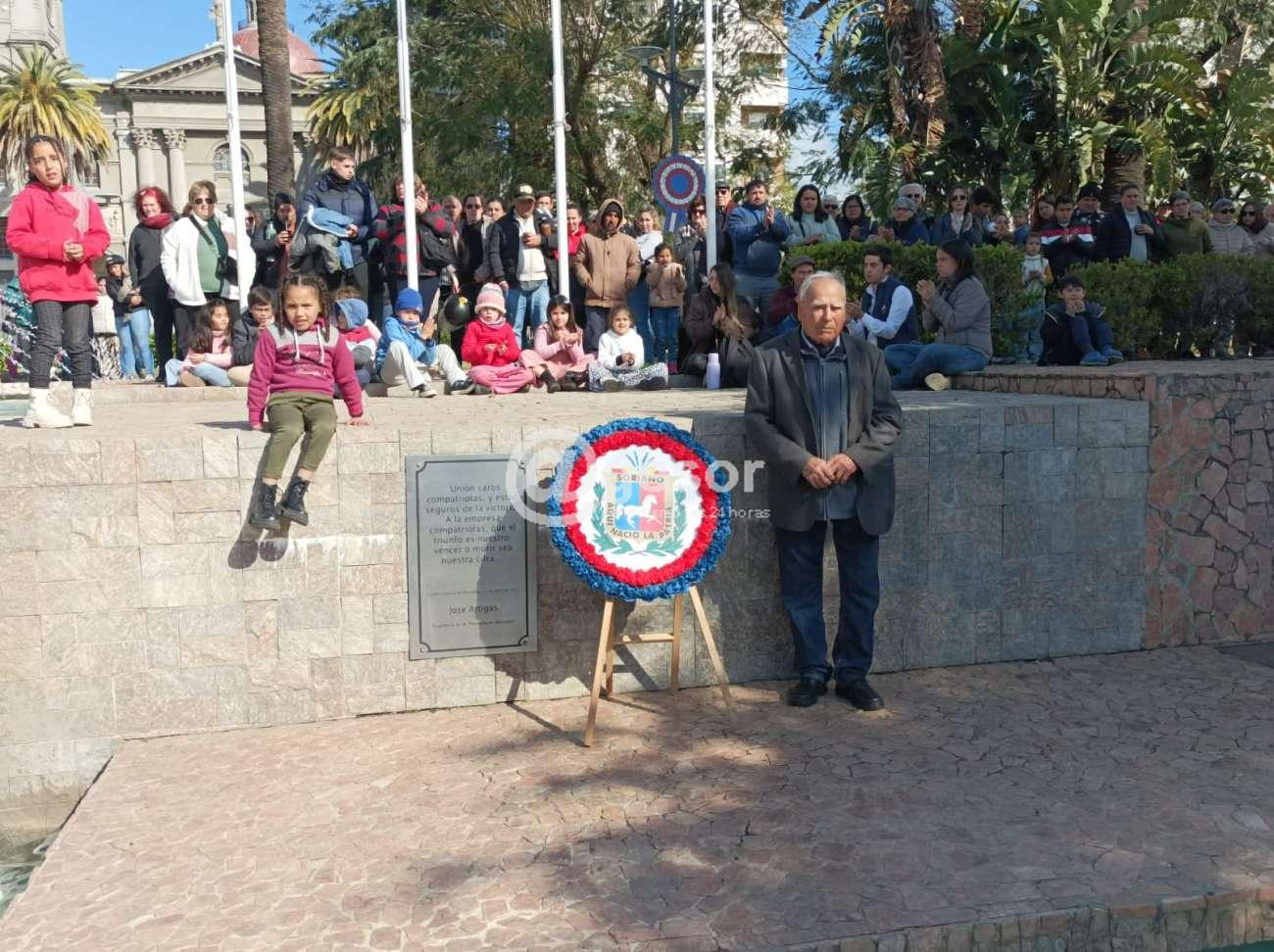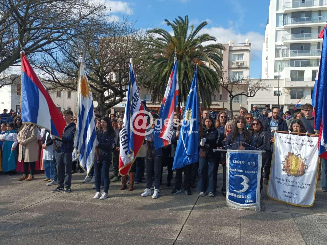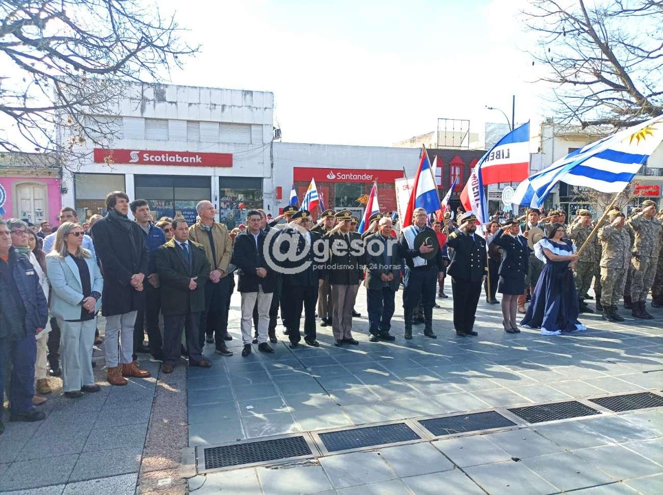 Con la presencia de autoridades departamentales encabezadas por el Intendente Guillermo Besozzi (que vino integrando la Marcha Aquí Nació la Patria), el Presidente de la Junta Departamental de Soriano, Gonzalo Novales, Diputado Enzo Malán, Diputado en funciones Lic. Javier Utermark, Ediles, autoridades civiles y militares, de centros de enseñanza, integrantes de la Asociación Patriótica de Soriano presidida por Barnardo Urchipía, representantes de las Unión de Instituciones Tradicionalistas, y público en general que en muy buen número acompañó la ceremonia oficial que tuvo como aporte musical la presencia de la Orquesta Mercedes tanto el preludio como en la ejecución del Himno Nacional y Marcha Mi Bandera y posteriormente hubo show musical.