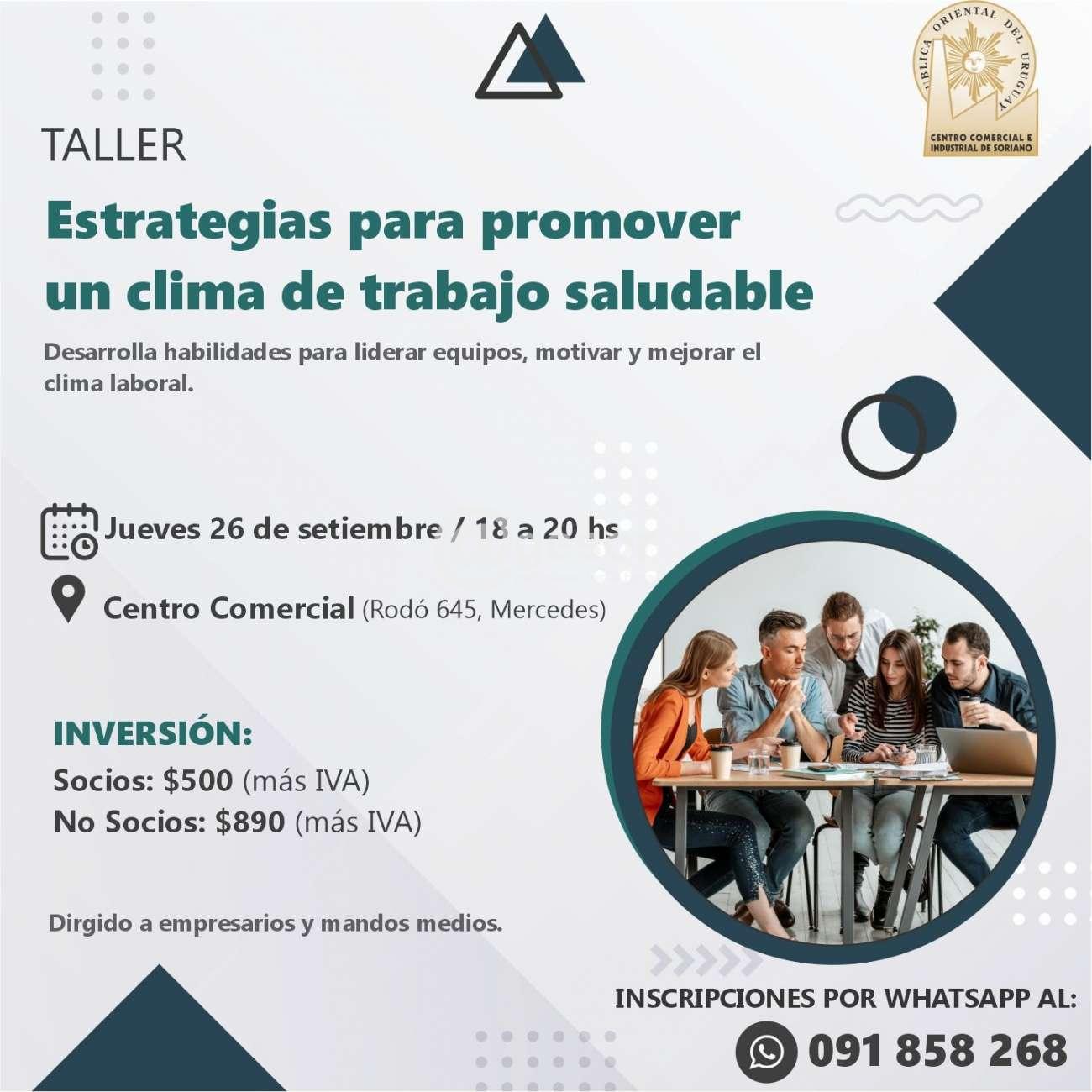 El jueves 26 de setiembre en el Centro Comercial e Industrial de Soriano (Rodó 645, Mercedes) de 18.00 a 20.00 horas, estará desarrollándose taller sobre "Estrategias para promover un clima de trabajo saludable".