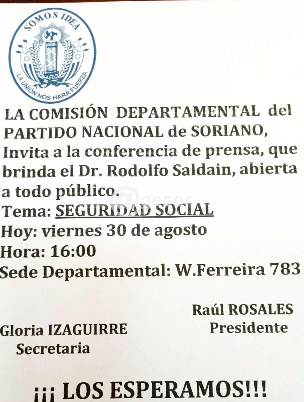 LA COMISIÓN DEPARTAMENTAL del PARTIDO NACIONAL de SORIANO, invita a la conferencia de prensa que brinda el Dr. Rodolfo Saldain sobre ¨Seguridad Social¨, abierta a todo público