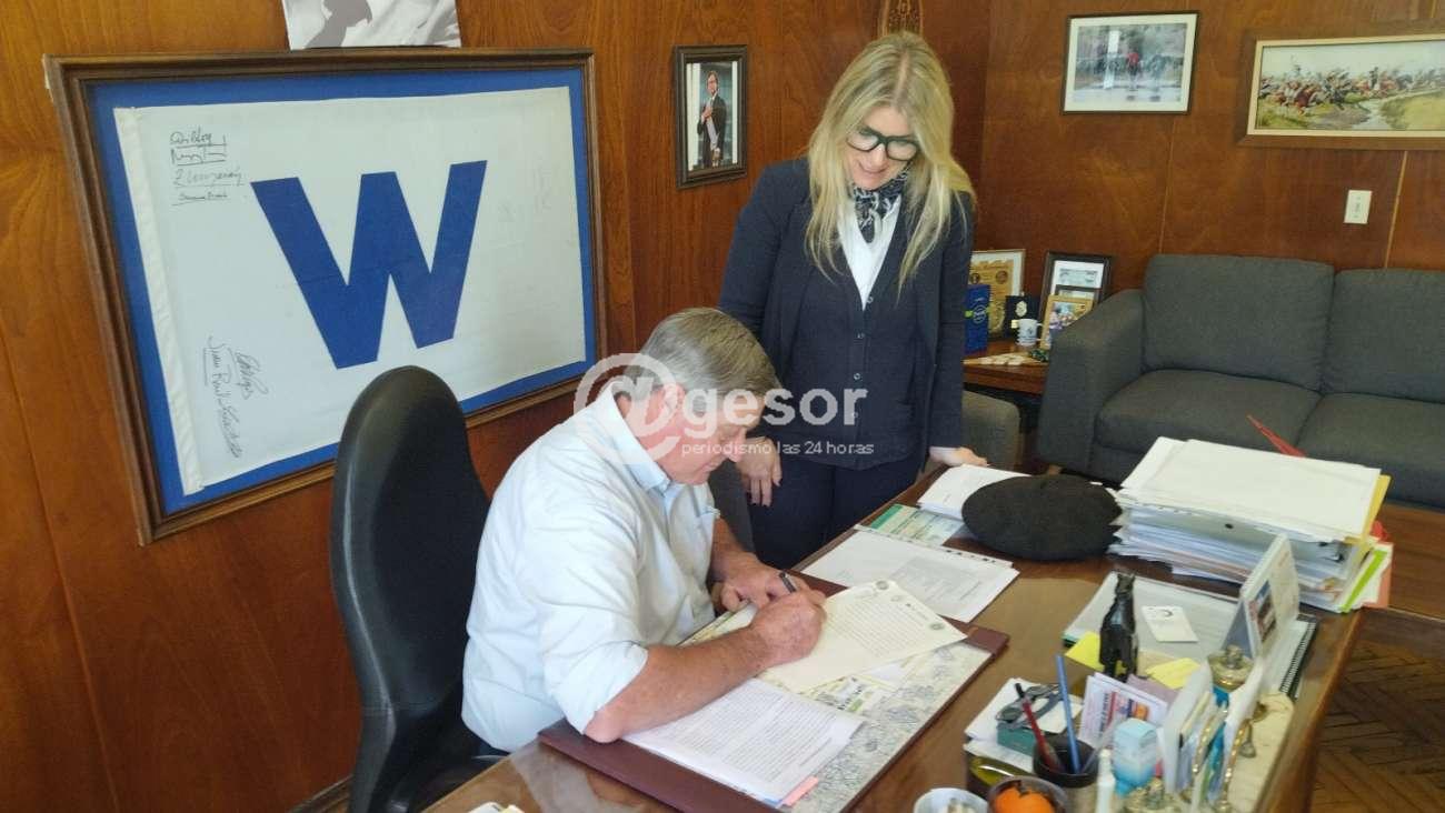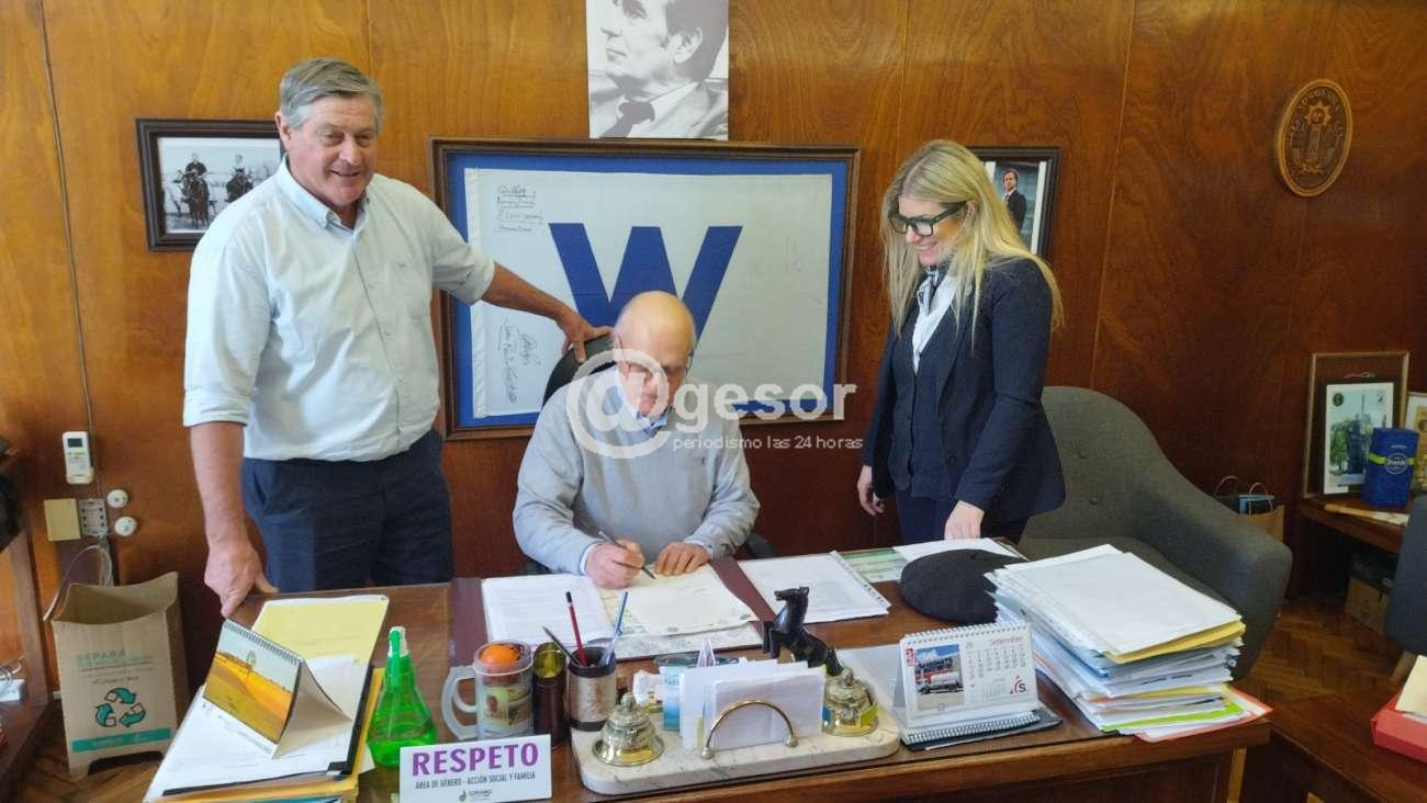 En el acto de firma estuvieron presentes el Intendente de Soriano, Guillermo Besozzi, el Secretario General de la comuna, Esc. Daniel Gastán, junto al alcalde de Palmitas Juan Vinçón y la edila María Jaime.