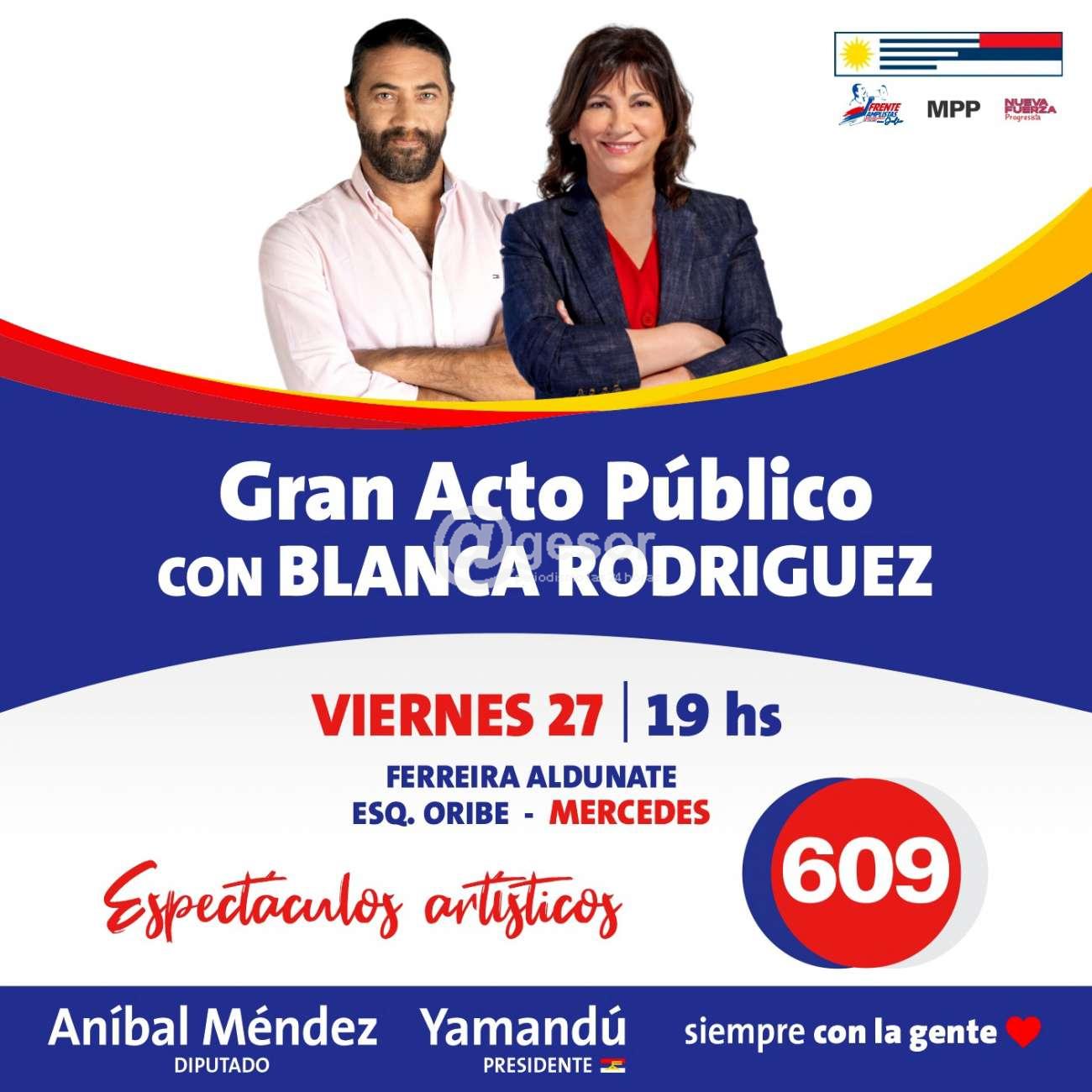 Este viernes 27 de setiembre a las 19.00 horas, en Ferreira Aldunate esquina Oribe, el Espacio 609 de Soriano te invita a gran acto público con la presencia de BLANCA RODRÍGUEZ segunda candidata al Senado, que estará visitando el departamento para acompañar la candidatura a la Diputación de ANÍBAL MÉNDEZ.