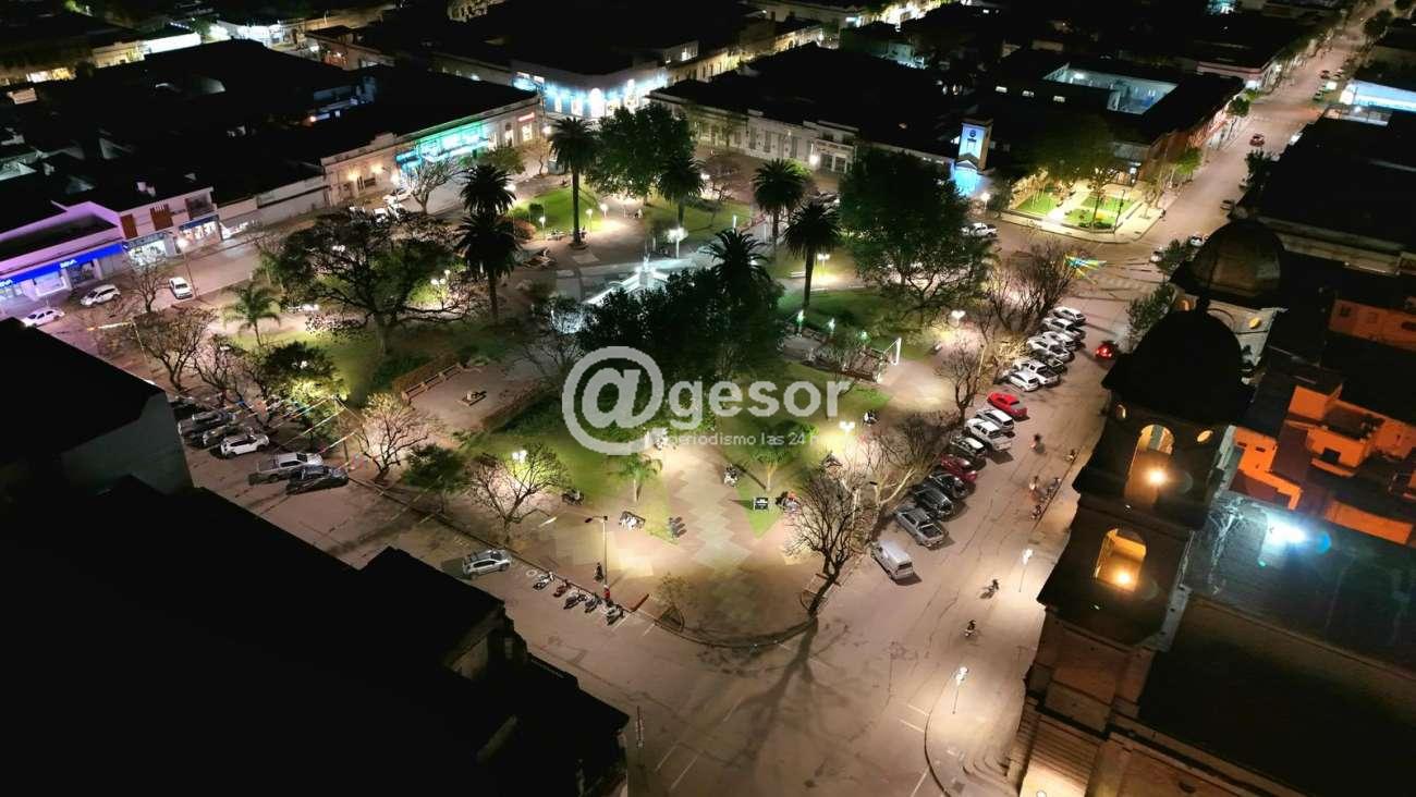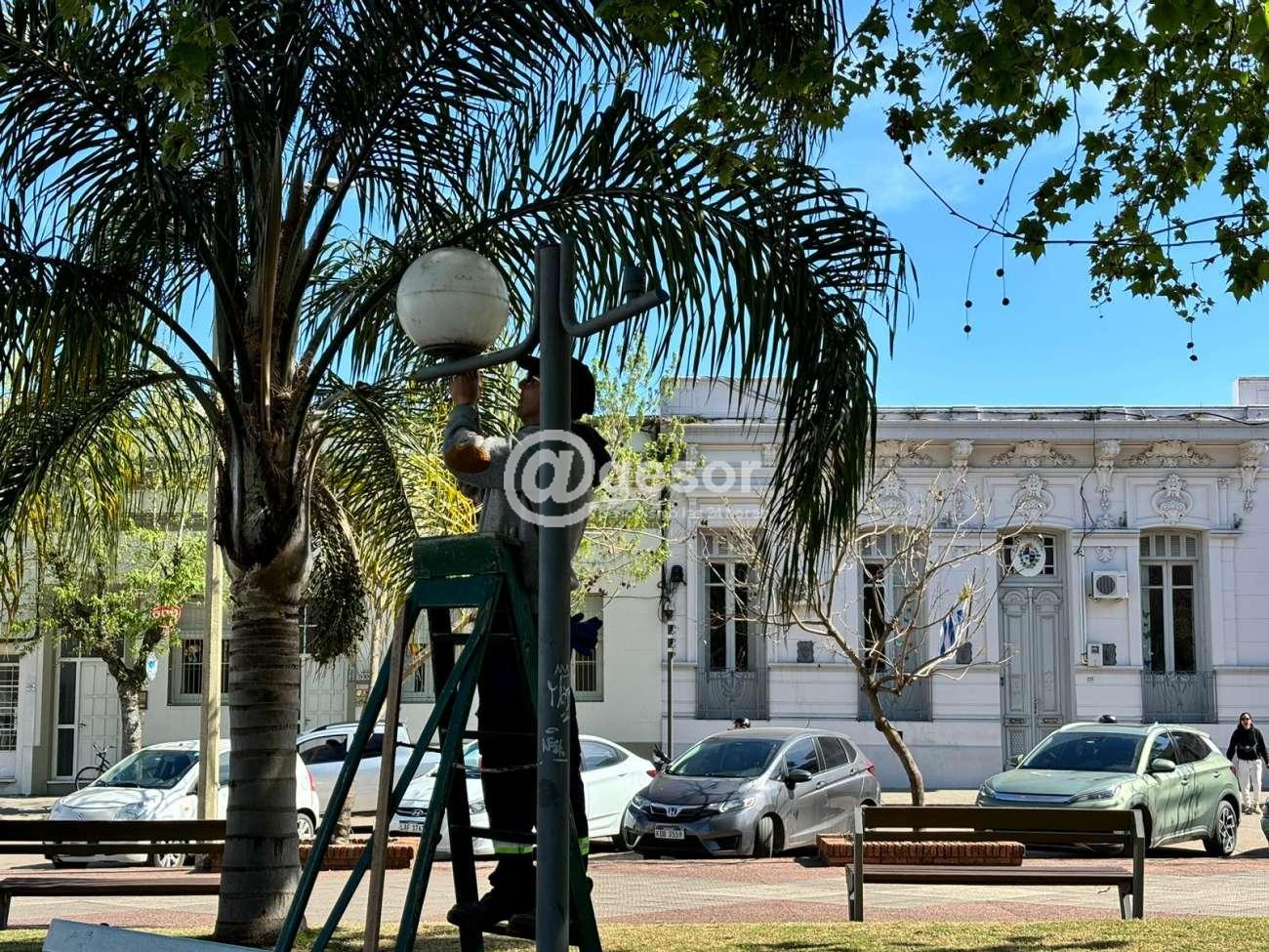 Quedó culminado el recambio de las antiguas farolas redondas por 60 focos LED de 50w en trabajo conjunto del Municipio con la Intendencia de Soriano, en plaza Constitución de Dolores.