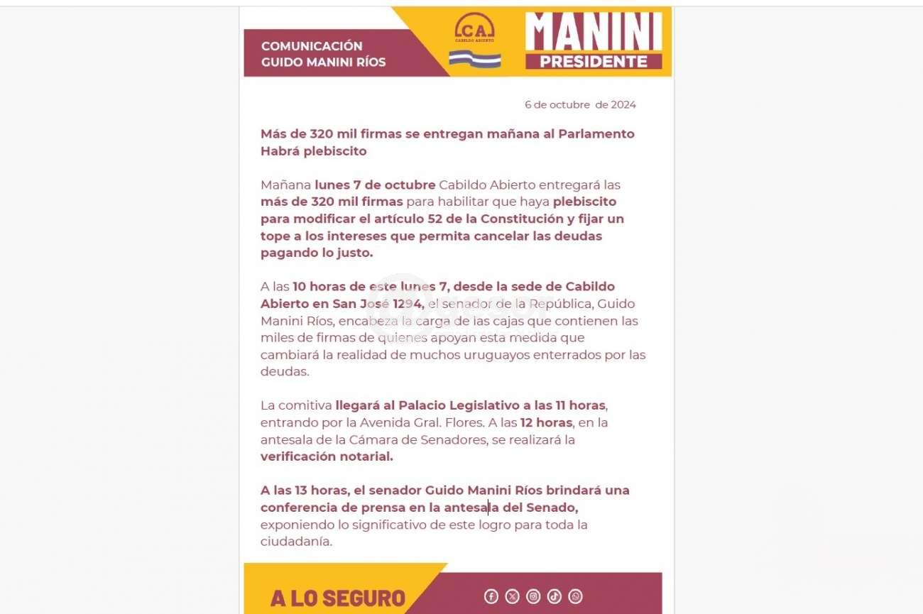 A las 13.00 horas, el senador Guido Manini Ríos brindará una conferencia de prensa en la antesala del Senado, exponiendo lo significativo de este logro para toda la ciudadanía.